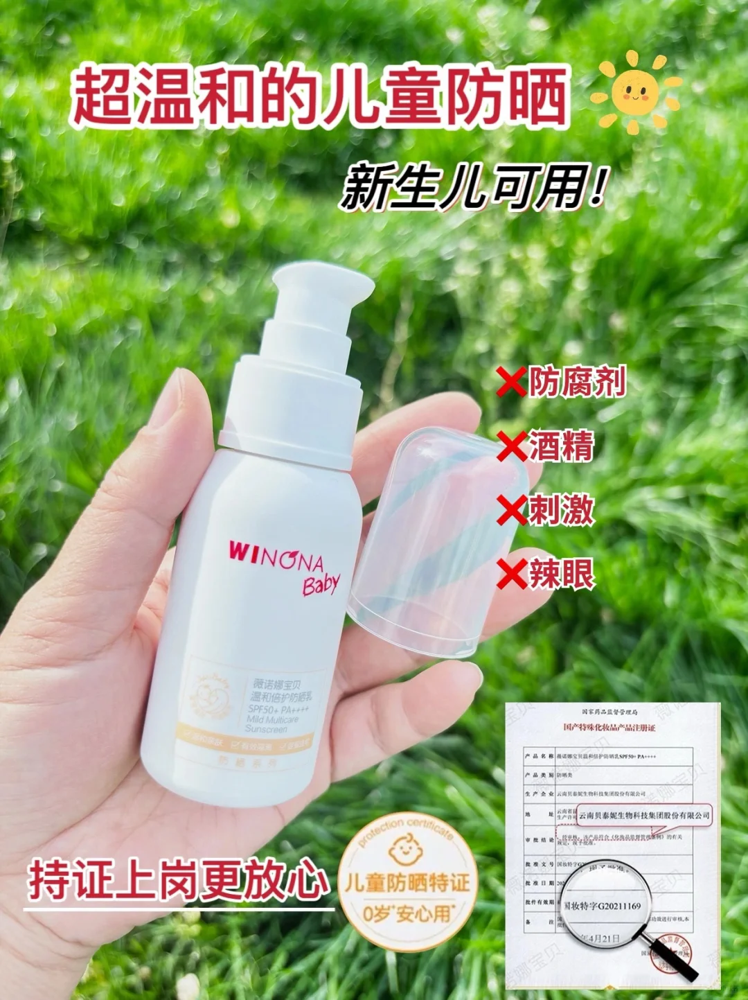 我家去年用的低倍防晒,用了跟没用一样😫~小脸晒的黑乎乎的……于是今年做足功课,早早入手了薇诺娜儿童防晒🙋🏻♀️,是专为问题肌宝宝研发的儿童防晒,亮点就是温和安全,通过了√76项风险测试,专门做了临观检测,拿到了临观检测报告,持有防晒特证+小金盾!安全方面没的说👍🏻,是新生儿都可以直接用的防晒❗目前市面上很少防晒能做到。