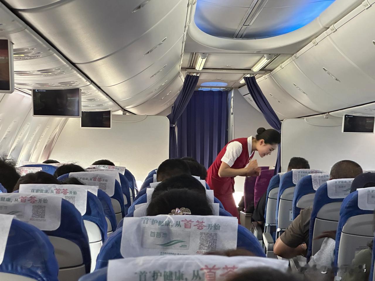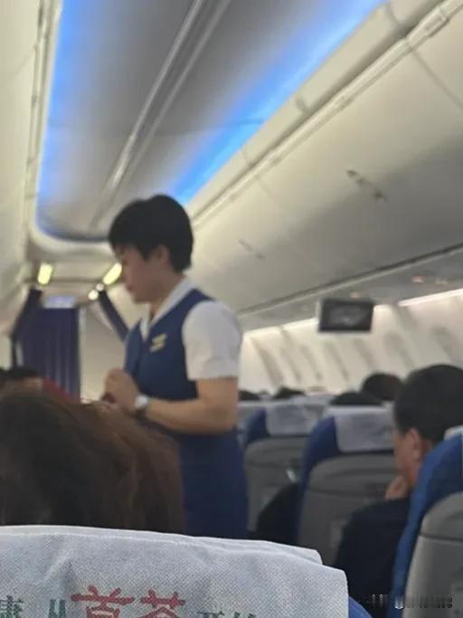 但是乘务员看到后觉得非常抱歉,先是跟我表达了歉意,又是要给我冰块冷敷一下,我赶紧说我没事。后面两位乘务员至少来回三四趟询问我的膝盖状况,我说膝盖无恙了,并向她们微笑致谢。