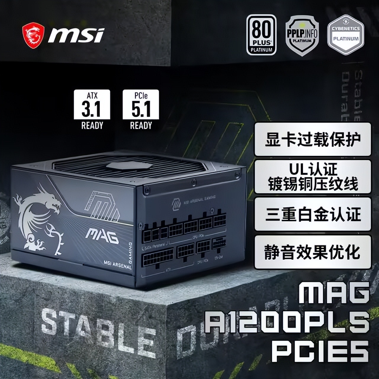 MAG A1000PLS PCIE5“战斧导弹”是微星面向单卡旗舰平台(如RTX 5090/5080/4090)推出的高性价比白金牌电源。它基于 ATX 3.1 / PCIe 5.1 规范,并通过 80PLUS、Cybenetics、PPLP 三重白金认证,转换效率领先金牌产品。核心功能支持GPU Safeguard显卡过载保护,并提供 10 年质保。