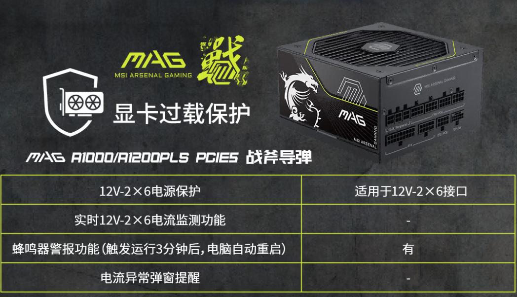 MAG A1200PLS PCIE5“战斧导弹”电源和MAG A1000PLS PCIE5战斧导弹外观保持一致,同样遵循ATX 3.1与PCIe 5.1规范,同时通过了80PLUS、Cybenetics及PPLP三重白金认证,转换效率高于金牌标准。其核心卖点是支持GPU Safeguard技术,并享有10年质保。