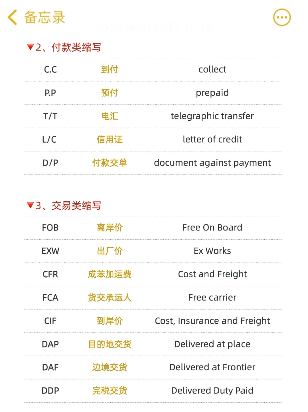 外贸新人,刚踏进行业是不是被一些缩写搞得晕头转向😂 我当年也是这样过来的~不要求全都记住,那真的太多了,不过熟悉一些常用贸易术语还是很有必要的! 给大家分了几类,来看看你都了解吗?!