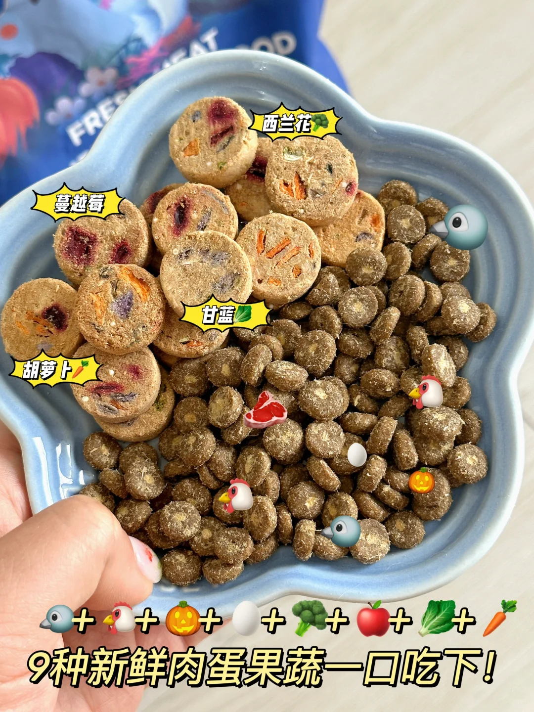 硬币那么大的蔬果生骨肉饼见过没有!!一块顶普通冻干四五个,满足感upup,完整果蔬颗粒肉眼可见,一口吃进去还有多重口味,想想就觉得很好吃!鹅且!狗粮每一粒都是专利的甜甜圈设计,满满当当的肉肉夹心同时还裹满了冻干碎!哪有挑食的狗子能抗拒得了!我家宝子直接暴风吸入,就连对那些零食的渴望都没那么大了hhh
