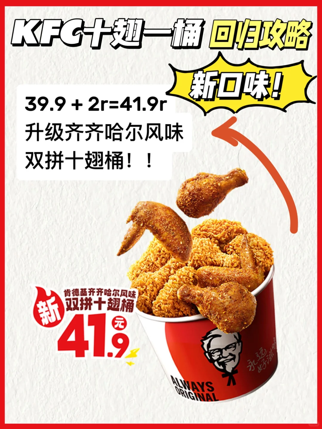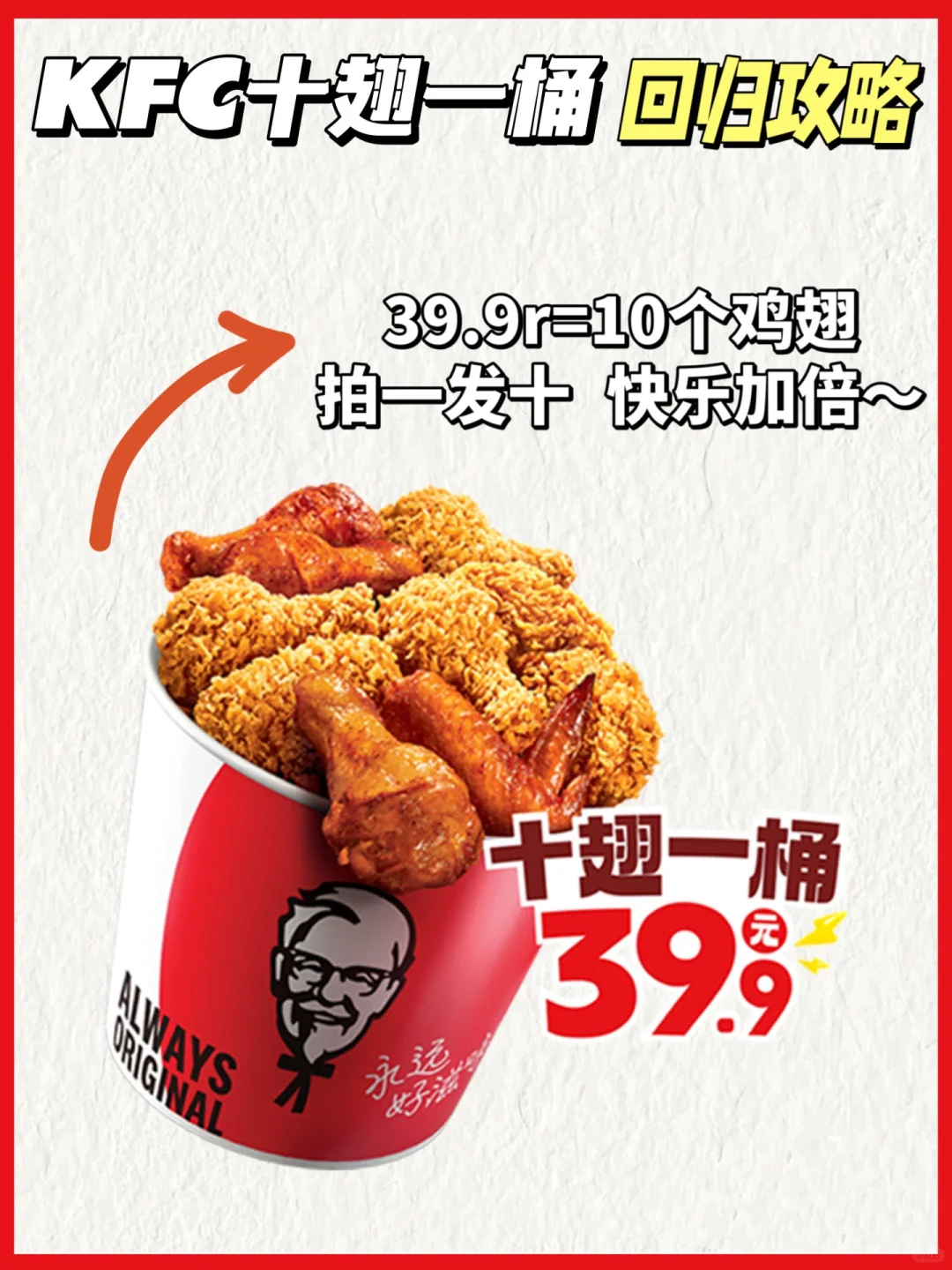 肯德基十翅一桶终于回归啦! 39.9r=10个鸡翅 拍一发十,实现吃翅自由 好炸鸡有鳞片,辣翅的香脆外皮真的绝了 新奥烤翅外焦里嫩,鲜嫩多汁! · 再划个重点‼ 新口味齐齐哈尔风味烤翅上线 在39.9r的基础上,+2r 即可升级成齐齐哈尔风味双拼十翅桶 滋滋现烤,纯正又地道的烟火气,香迷糊了 回归第一周还能得限量特别翅膀桶套! · 📆5月27日-6月23日 谢谢你!肯德基!这个六一好快乐!!