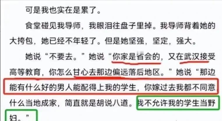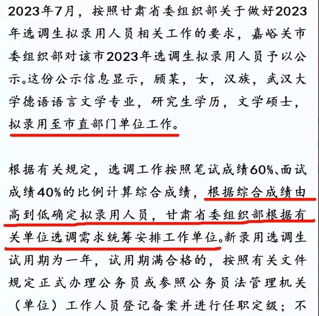 武汉大学女大学生不满嘉峪关“穷山僻壤”,辞去选调生一事,可能各有各的看法,但有一点非常值得深思,那就是其导师的“劝导”! 当事人顾某,2023年甘肃省选调生,招录以后分配至嘉峪关。通过女子自文可以看出,不愿意到嘉峪关这样的落后的嘉峪关隔壁小县城,在那里被禁锢,动弹不得。甚至自比为奴隶等等,说的确实难听。 女子还发文称,在食堂碰到导师,眼泪啪啦啪啦的往盘子里掉。导师也劝导她,家省会的,又是武汉受过高等教育,不能去那小地方,不能当“野妇”。 女子为什么不理解省里安排选调生基层锻炼的初衷,接受不了小县城的生活,根源在哪? 可能就出在教育上,但看其导师的劝导,教育肯定是出了问题的。 其导师的思想实在是有悖于当下倡导的价值观,省会出身,武汉大城市高等教育,就高人一等了吗?就必须一毕业就去大城市,坐办公室,指挥千军万马吗? 这个事件,更值得反思的是大学的教育问题。育才不育德十分的可怕。也就有了顾某看不上小城市,感觉自己就是“仙女”,不该下凡间的想法和做法。 省委选调生,不可能直接在省级机关工作。大学毕业,基层什么样子都不知道,怎么坐在省级机关里指导基层?无非是纸上谈兵,夸夸其谈,不接地气。