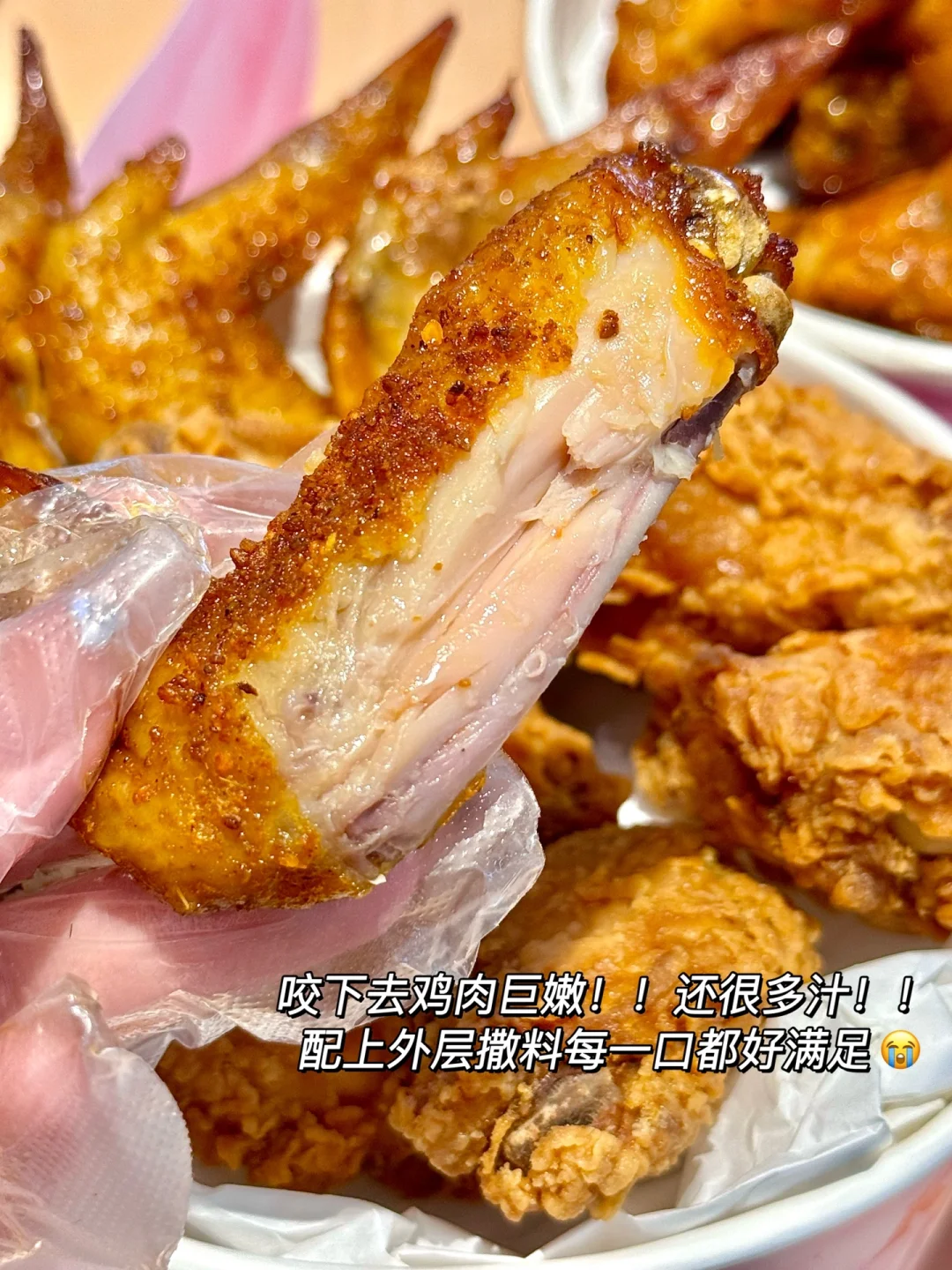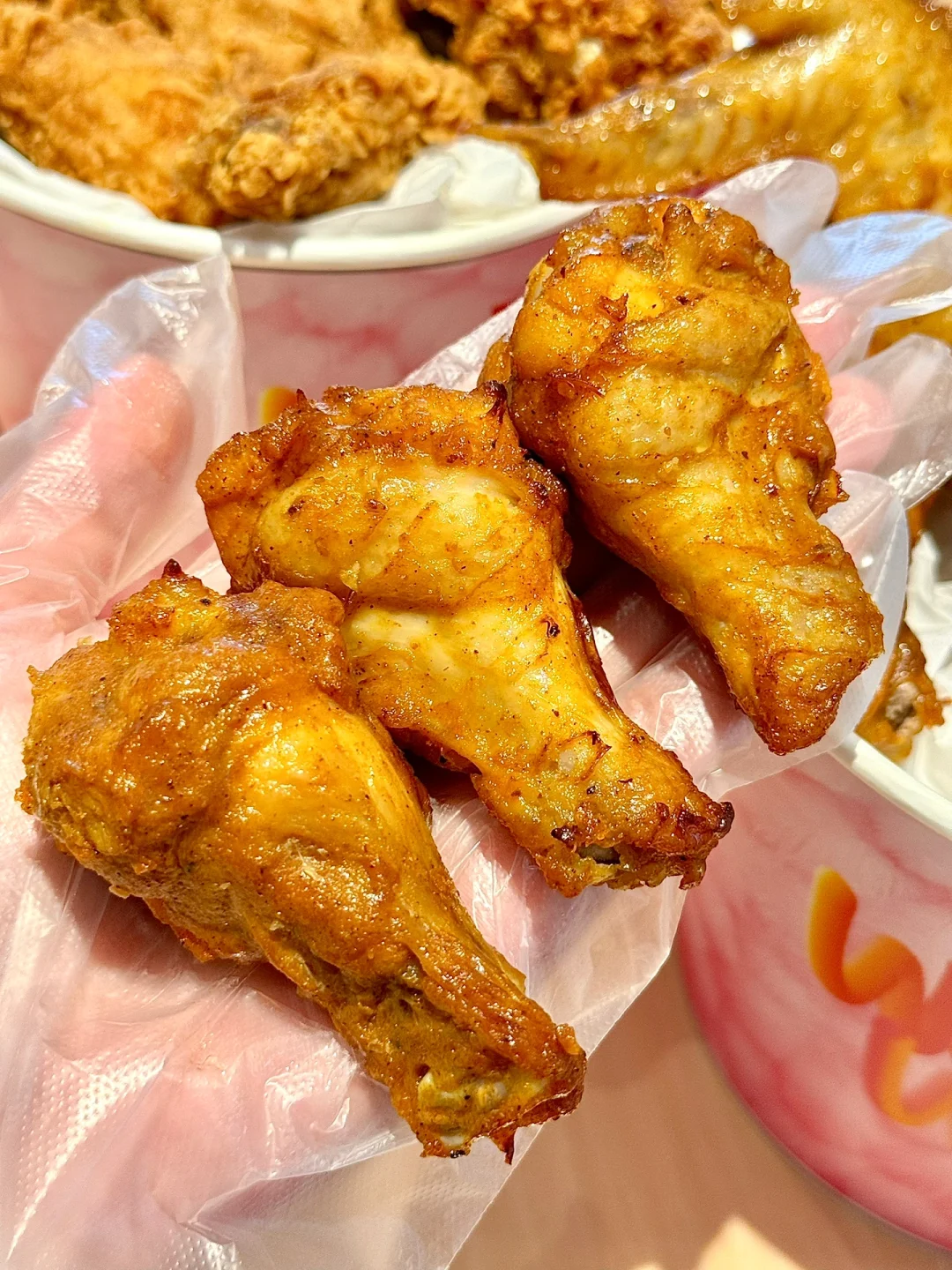 永远吃不腻的款!!辣翅的金黄鳞片酥脆到掉渣!内里肉香四溢!烤翅还是熟悉的新奥尔良风味!咸甜鲜的结合尊嘟吼吼吃!!!