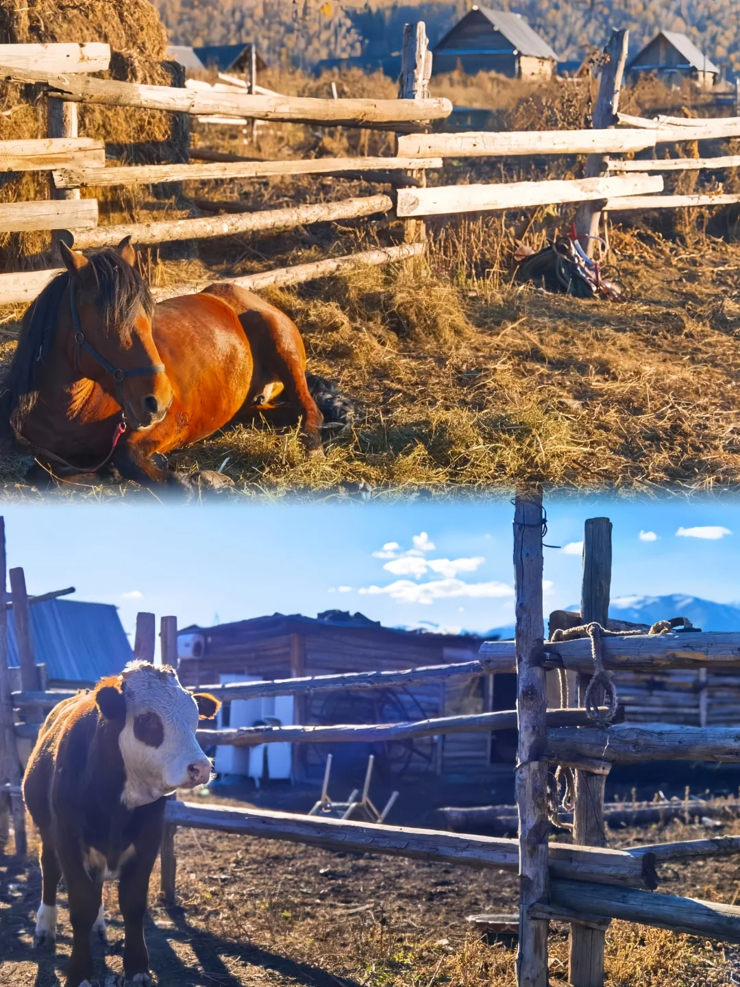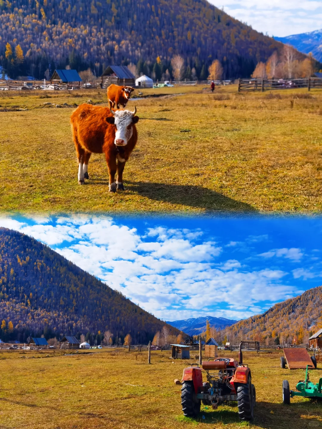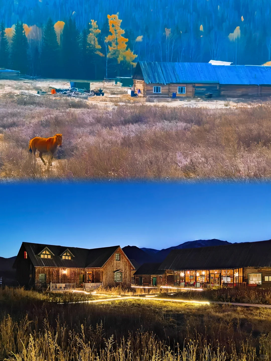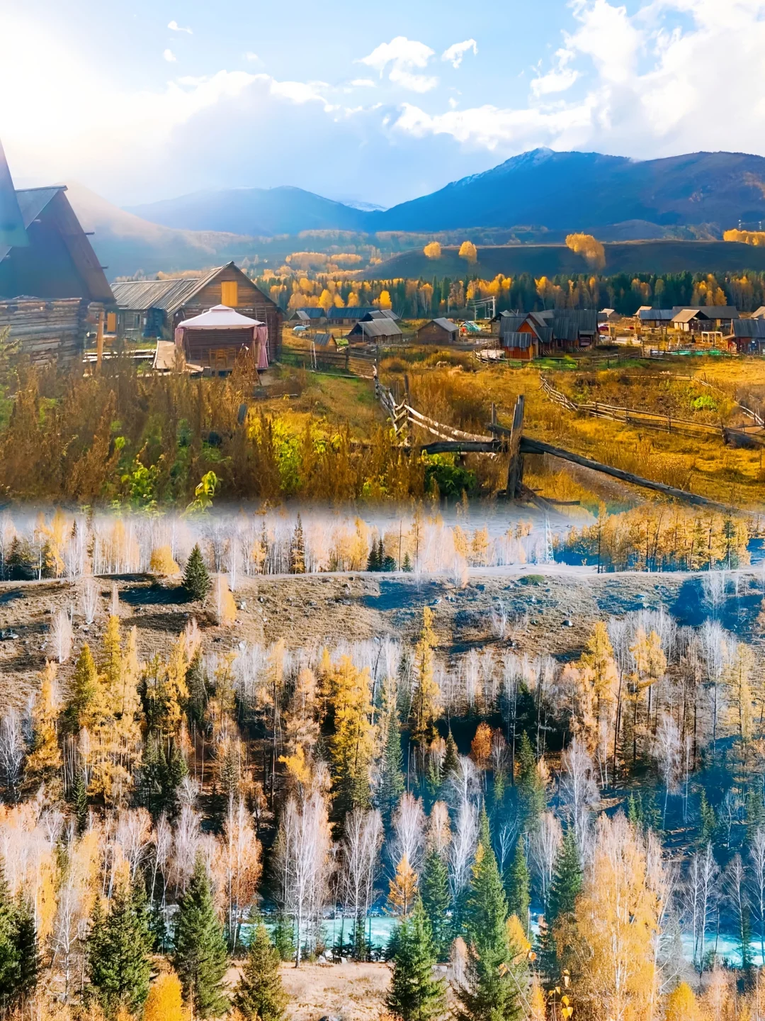 因为如果新疆最美好的夏天在伊犁,那最美的阿勒泰一定是在秋天。 来阿勒泰首推禾木! 直接导航到禾木风景区即可。 建议一定要留一个跨天给禾木,因为只有住在禾木的小木屋你才能体验到完整的禾木。禾木最美的地方不在禾木,而在只能骑马一个小时到达的美丽峰村。 从禾木骑马点策马奔腾,翻过小山后就是美丽峰村,牧民家的羊肉串和奶茶真的太绝了。 夜晚在禾木看着满天星斗,瞬间穿越到北欧