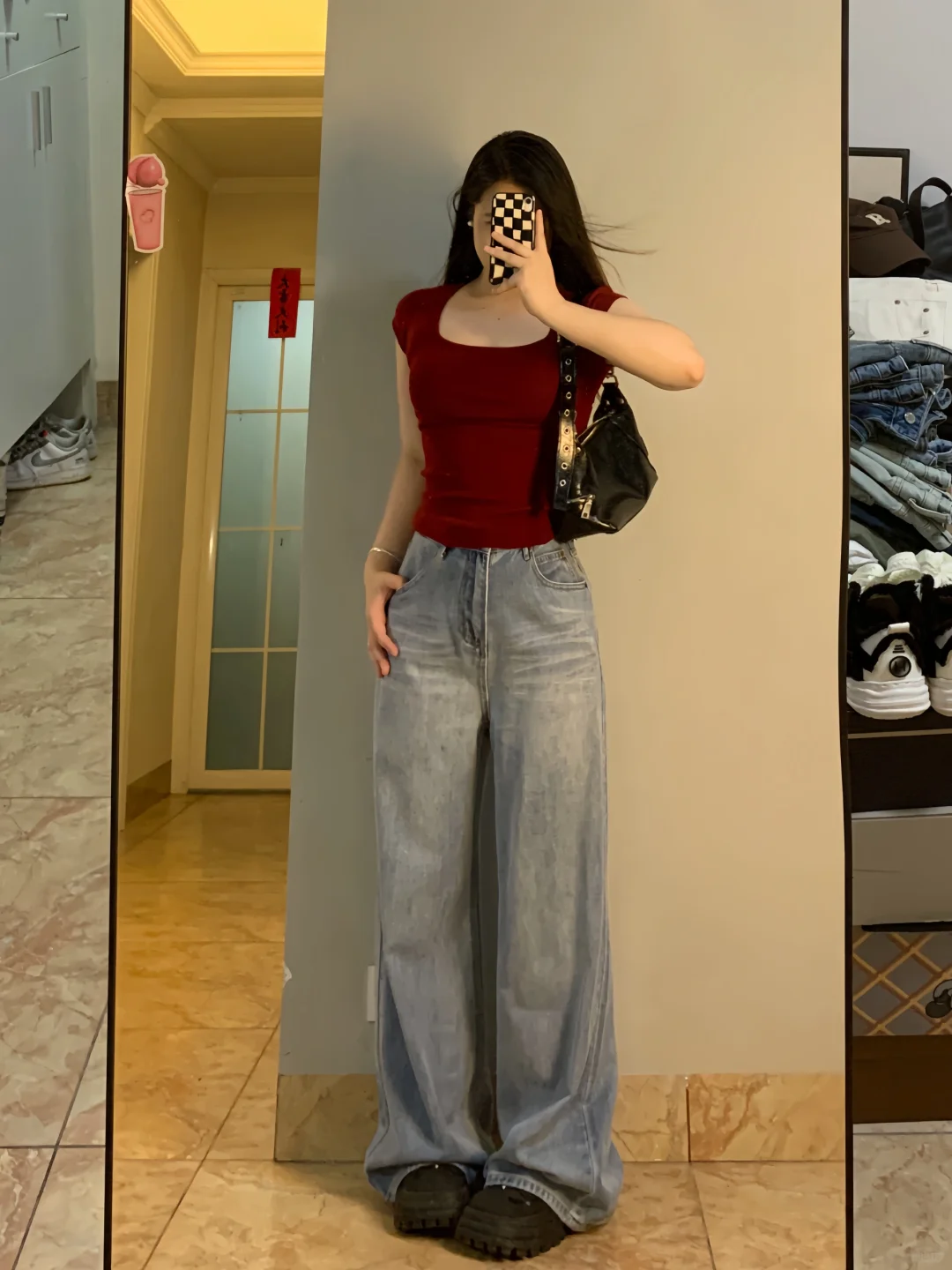 随性的一身,大方领阔腿裤,微胖也能穿出辣妹感,春夏就这样穿吧~