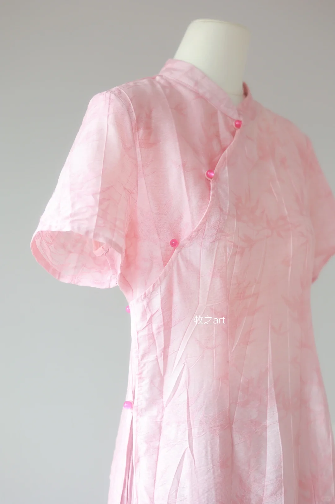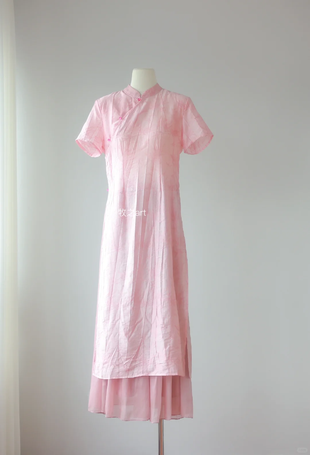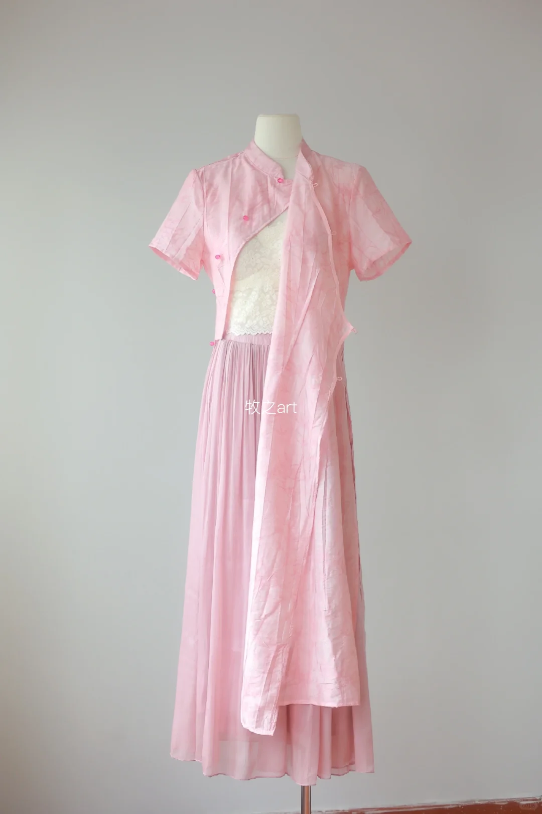 桃之夭夭,灼灼其华 温柔气质的旗袍款式罩衫 搭配盘扣,将国风融入日常穿搭 面料轻盈舒适 罩衫用清新淡雅的提花点缀, 内搭简单搭配一件蕾丝吊带裙,自带一份朦胧美感 连衣裙下摆高开叉设计,结合半身裙,叠穿元素,丰富穿搭感~ -