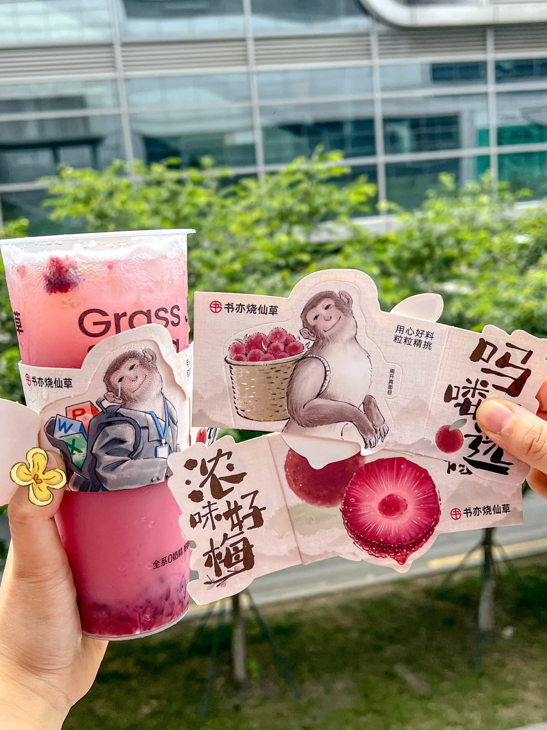 看我发现了什么新东西! 书亦居然跟吗喽联名了!! 哪个打工人不是当代小吗喽呢🥲🥲 · 两杯新品都是杨梅系列 ✔杨梅白月光 ✔多肉杨梅 推荐微糖,超清爽der~ 香水柠檬和茶汤融合的超好,层次很丰富 而且杨梅果肉口口爆汁!谁喝谁知道 · 联名周边攻略 5.24-5.30期间,新品9.9r一杯 且买一杯就送吗喽杯套和卡套哦!