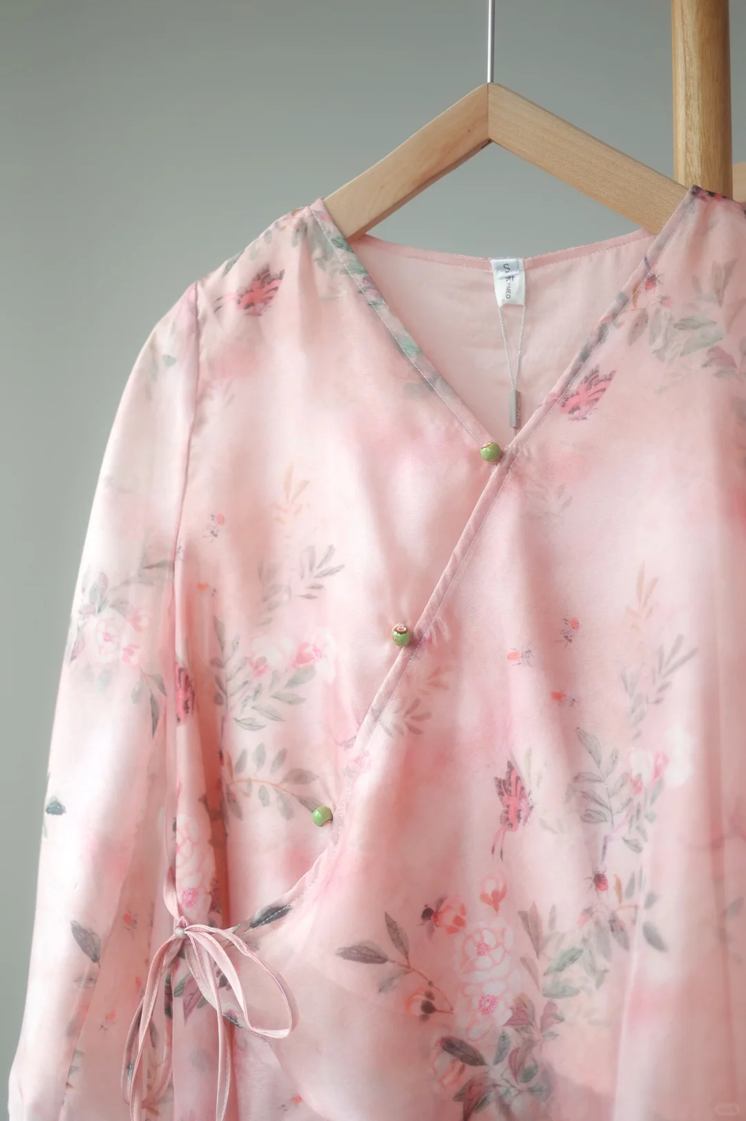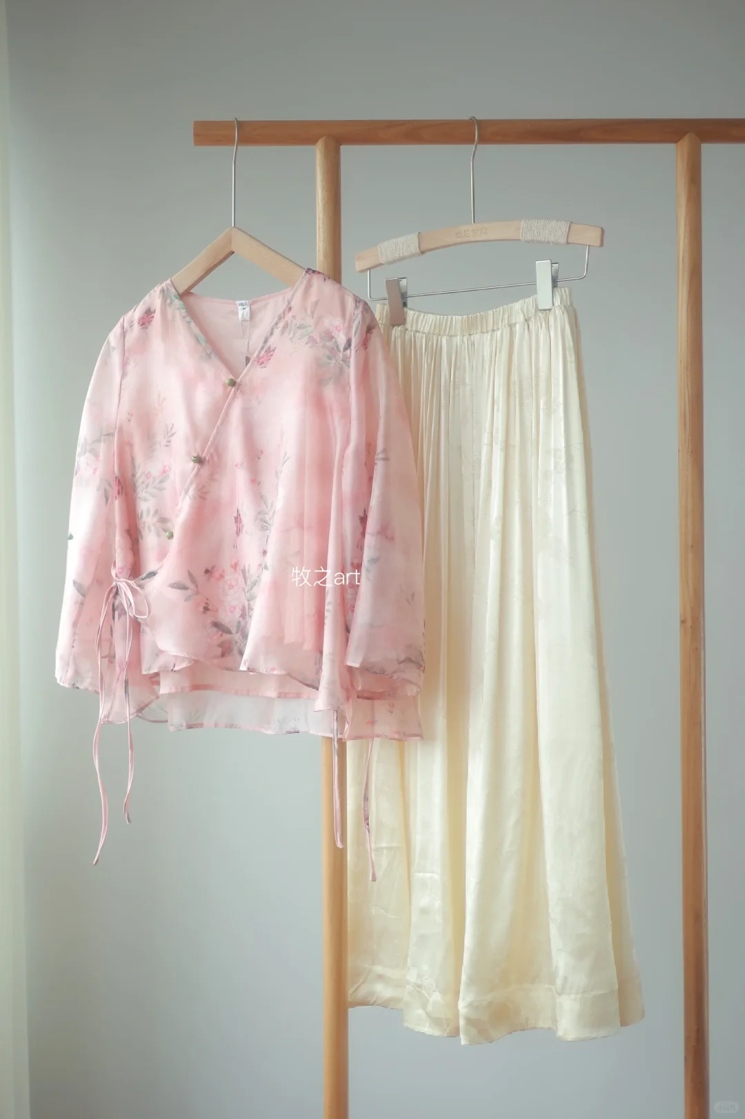 搭配一件缎面长裙好美啊 非常有质感 自带古典温婉感的面料,印花很美 阳光下光泽感绝美,不由让人心动~ 交领设计,里面有内绑带整理,喜欢宽松就系松些 下摆层叠,像花瓣一样绽放 -