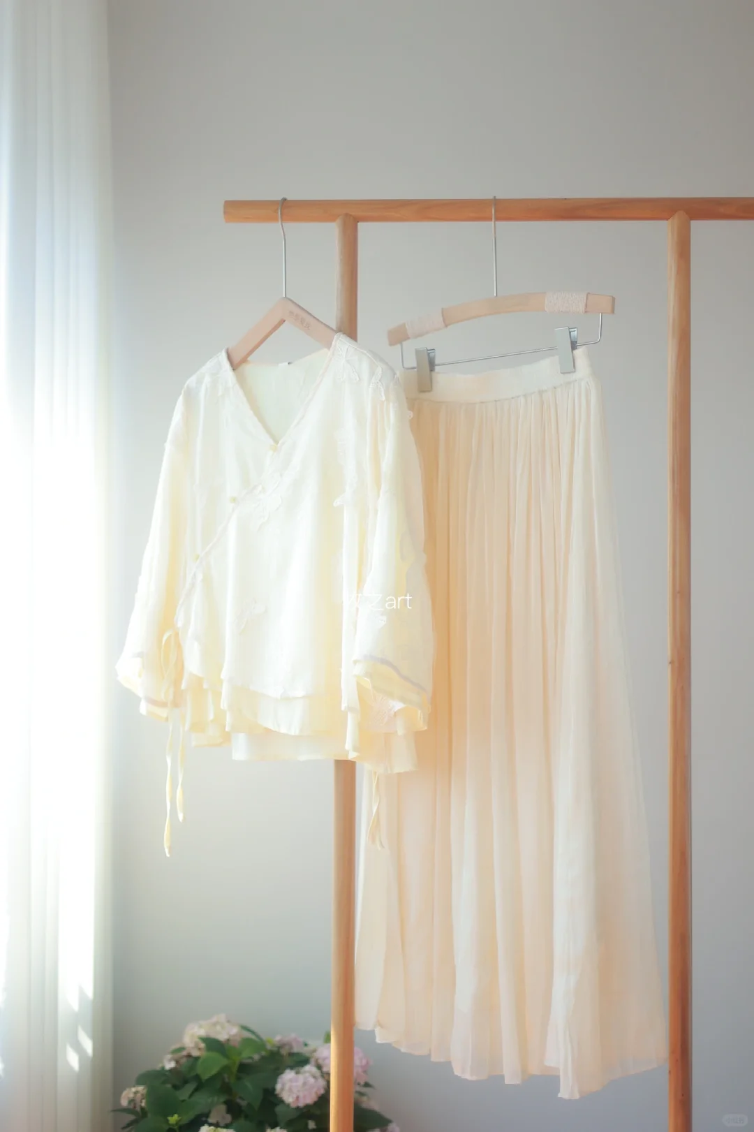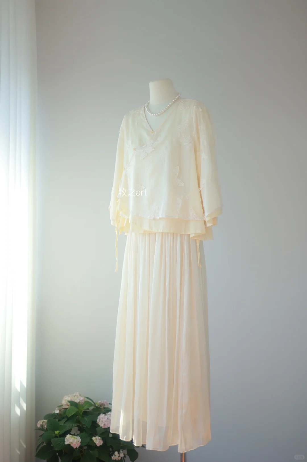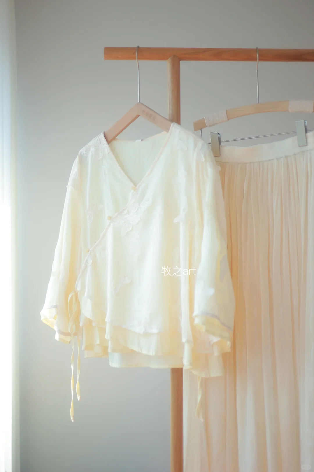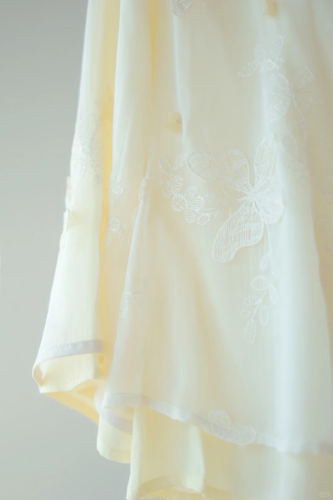 自带古典温婉感的面料,立体蝴蝶刺绣很美,栩栩如生 双层不透不闷汗,且自带仙气 阳光下光泽感绝美,不由让人心动~ v领领口,包容性比较强,里面有内绑带整理版型 下摆层叠,像花瓣一样绽放 -