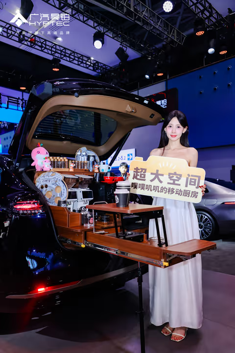 作为广汽旗下的豪华智能大五座SUV,昊铂HT此次与美食达人噗噗叽叽展开创新合作,将汽车后备箱巧妙改造为"移动咖啡馆"。这个创意十足的互动区,让观众在逛展之余还能品尝到特色暖饮,成为车展现场一道独特的风景线。
