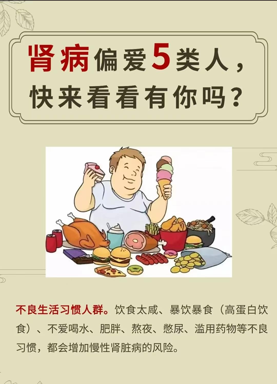 你有没有经常感到疲惫不堪,腰酸背痛?会这可能是你的肾脏在向你发出警告!《你知道吗,高血压、糖尿病、高尿酸血症/痛风、中老年人群以及不良生活习惯都是慢性"肾病的高危因素!“首先,让我们聊聊高血压人群。血压高是肾病发生和进展的危险因素之一。高血压人群应饮食清淡,将血压控制在140/90mmHg以下,这样能有效预防肾脏损伤的发生。必其次,糖尿病人群也需要关注肾脏健康。糖尿病肾病早期并无明显症状,仅尿中泡沫增多尿液检查可发现微量白蛋白尿;随着病情进展,尿白蛋白逐渐增加,并出现水肿、