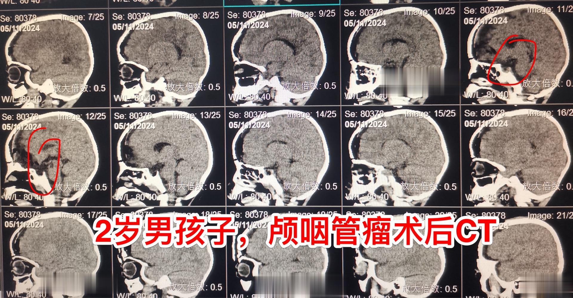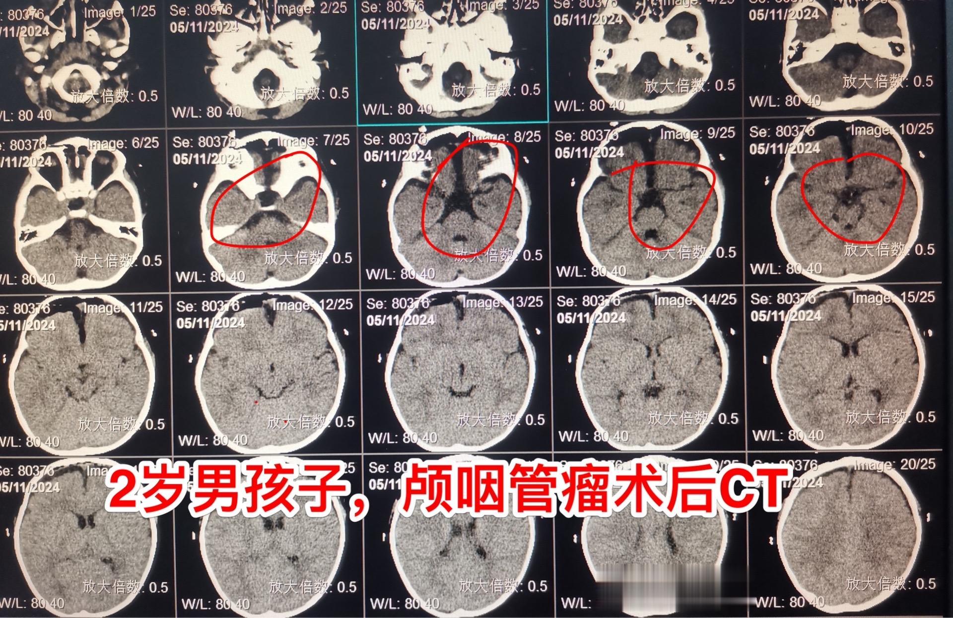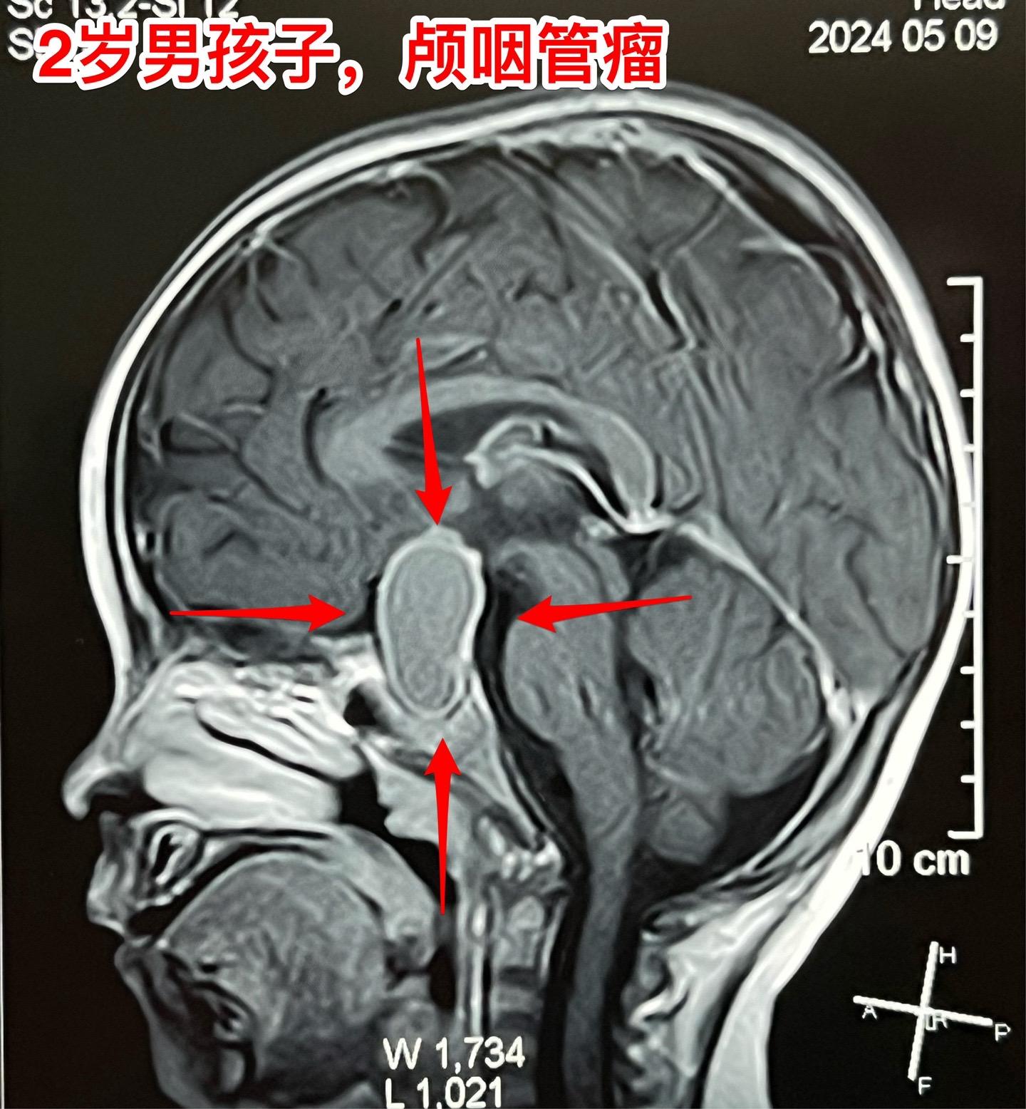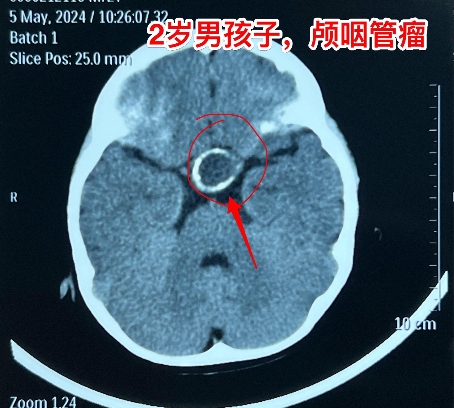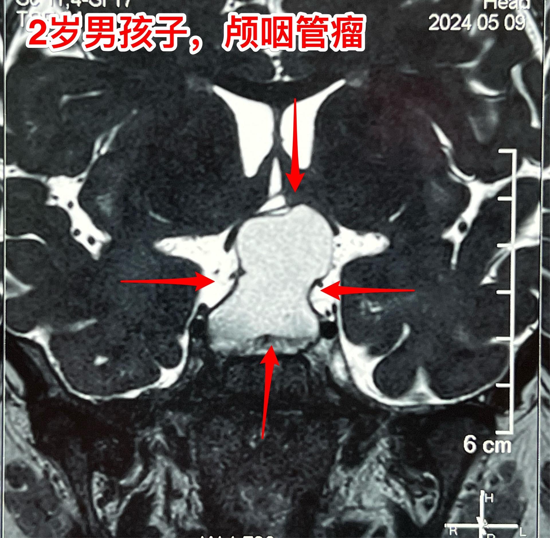 老天造孽哦,才2岁的孩子就患上颅咽管瘤。CT和磁共振显示是典型的颅咽管瘤,有钙化。视神经受压,视力有下降(还没有到失明的程度),不得不接受手术治疗。5月11日顺利将肿瘤完全切除。希望肿瘤不复发。