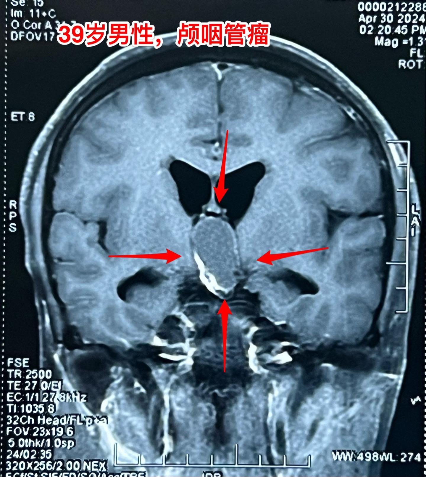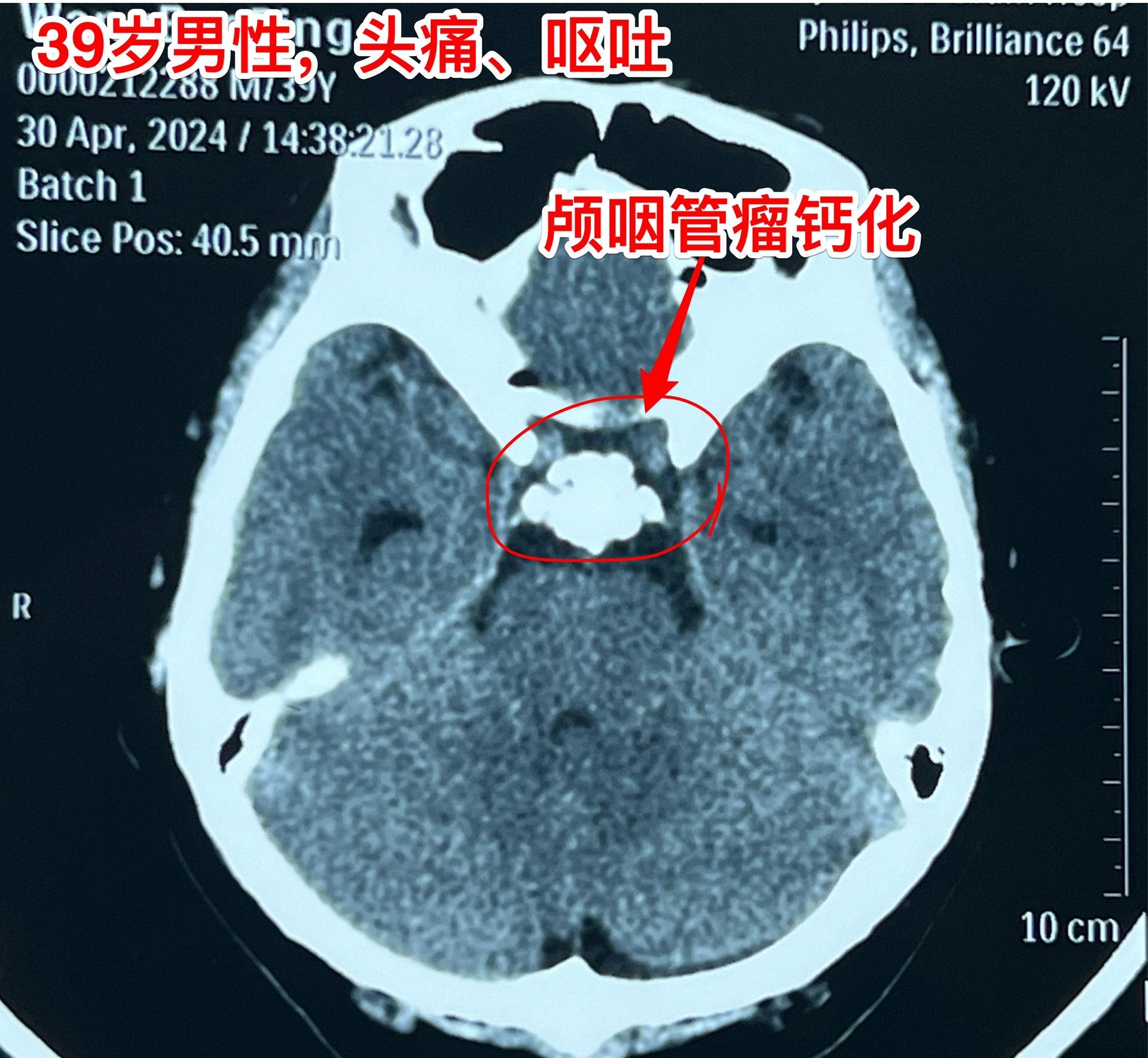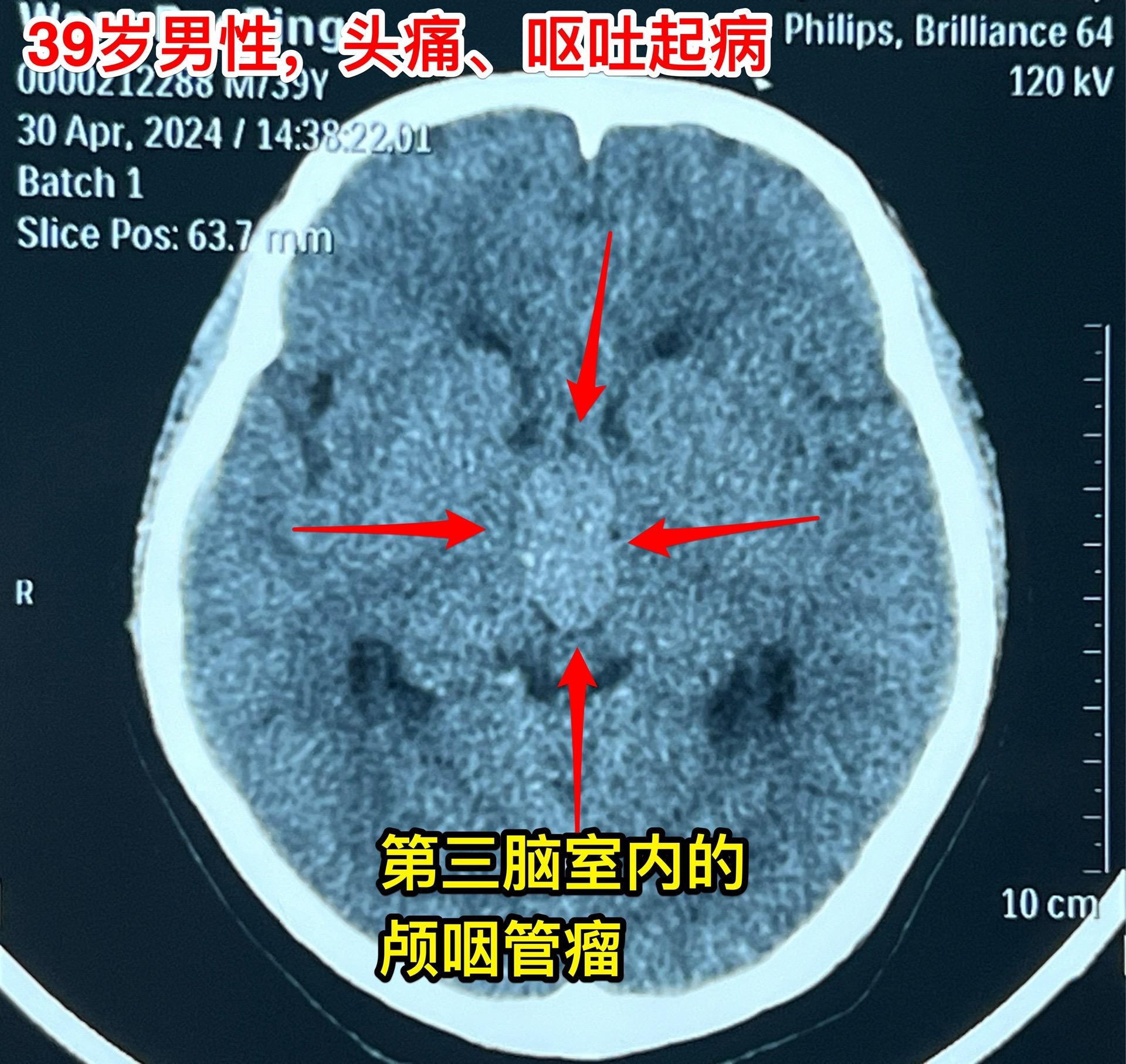 五月六日的颅咽管瘤手术。山西省男性,39岁,因为头痛、呕吐在4月29日就急匆匆的赶到三博脑科医院来住院。病因是颅咽管瘤造成颅压高,不能正常吃东西了。住院后用药物治疗,头痛症状减轻,也不呕吐,能正常进食。从图片可以看出这个颅咽管瘤属于细长型,从垂体窝延伸到第三脑室内,垂体窝里有大块钙化,手术是有难度的。 五一假期一过就排上手术,顺利切除肿瘤,手术后CT结果很让人满意,希望肿瘤不复发。