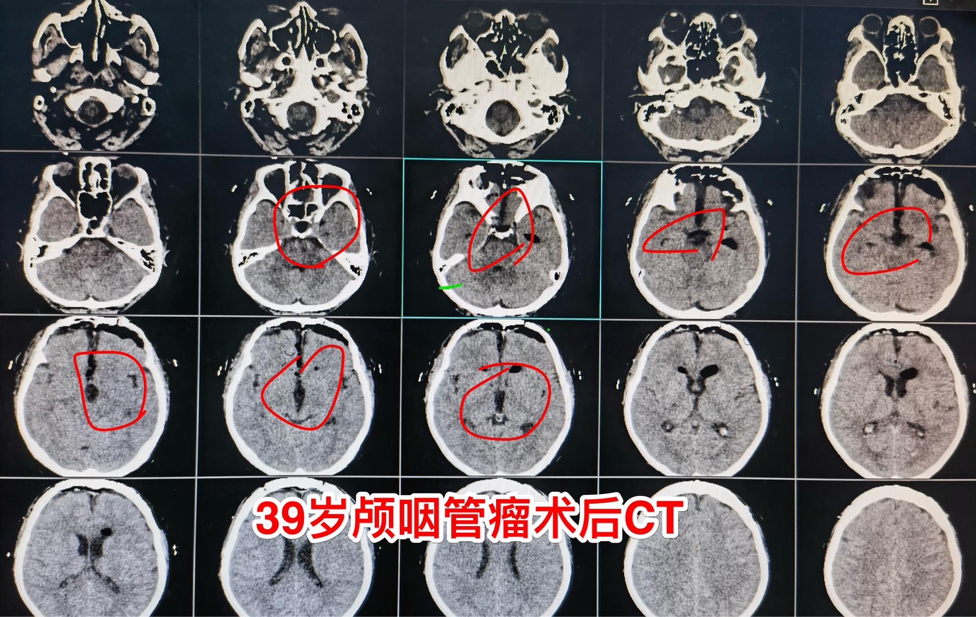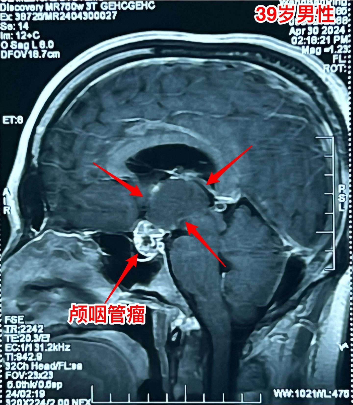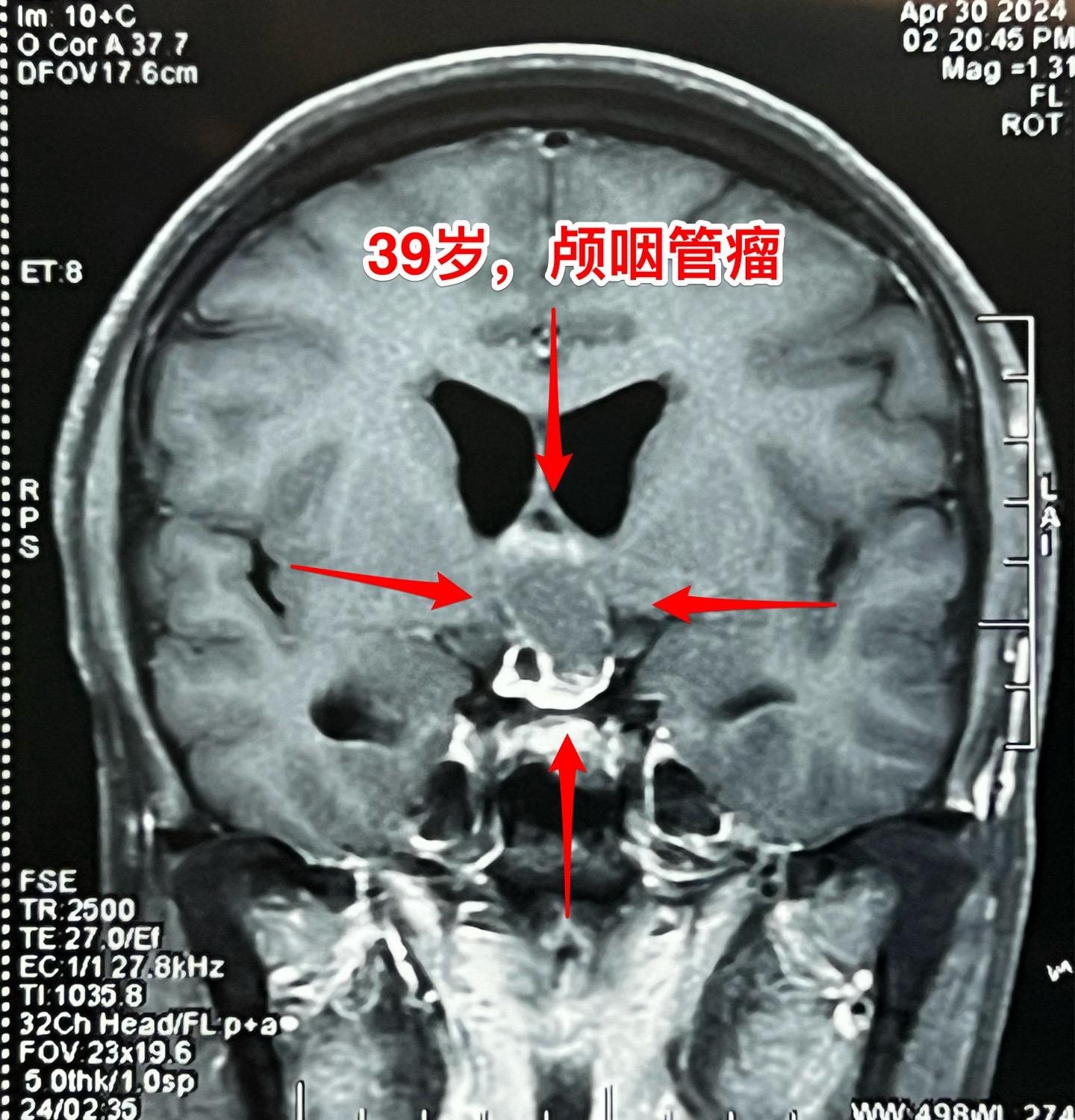 五月六日的颅咽管瘤手术。山西省男性,39岁,因为头痛、呕吐在4月29日就急匆匆的赶到三博脑科医院来住院。病因是颅咽管瘤造成颅压高,不能正常吃东西了。住院后用药物治疗,头痛症状减轻,也不呕吐,能正常进食。从图片可以看出这个颅咽管瘤属于细长型,从垂体窝延伸到第三脑室内,垂体窝里有大块钙化,手术是有难度的。 五一假期一过就排上手术,顺利切除肿瘤,手术后CT结果很让人满意,希望肿瘤不复发。