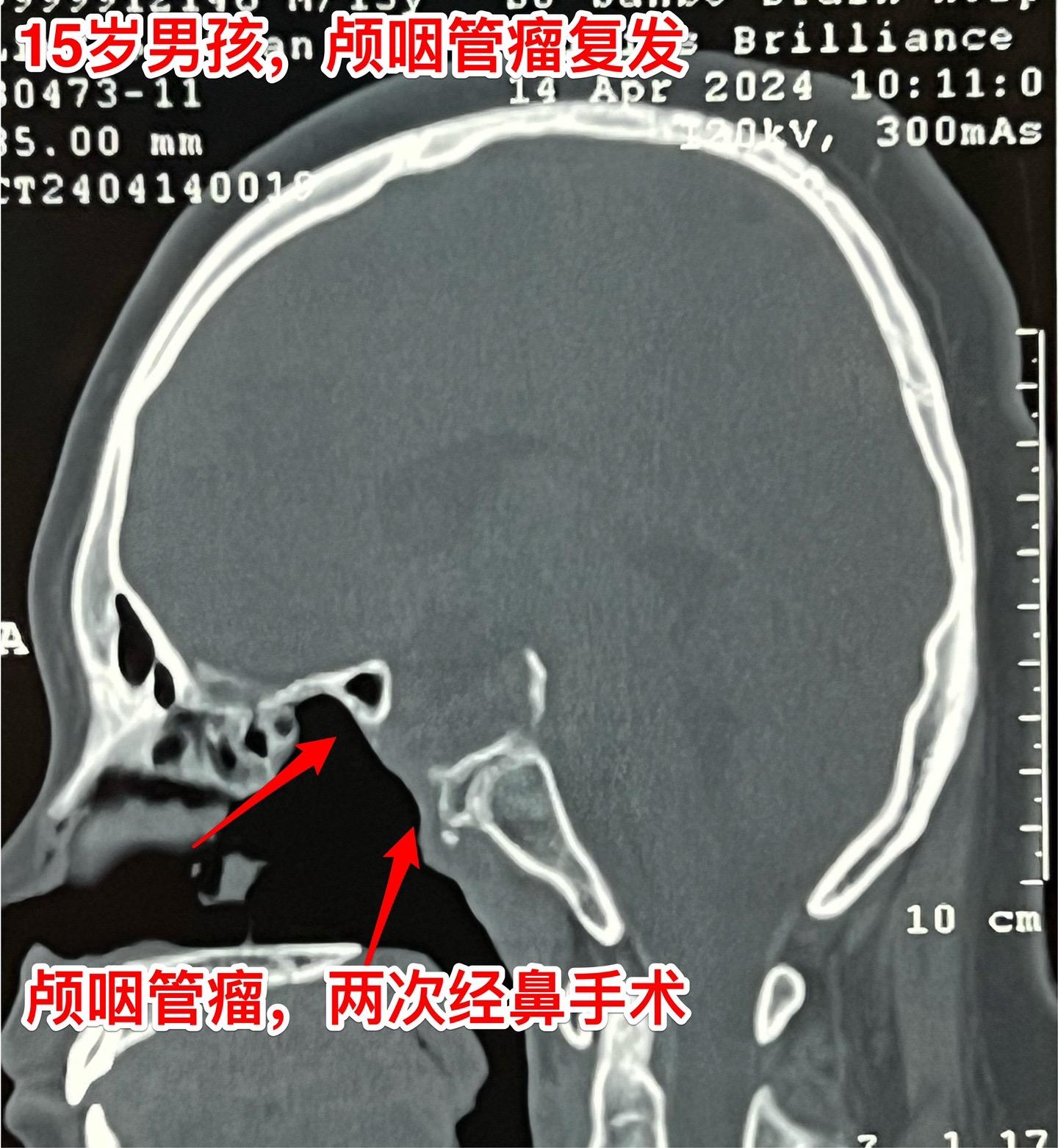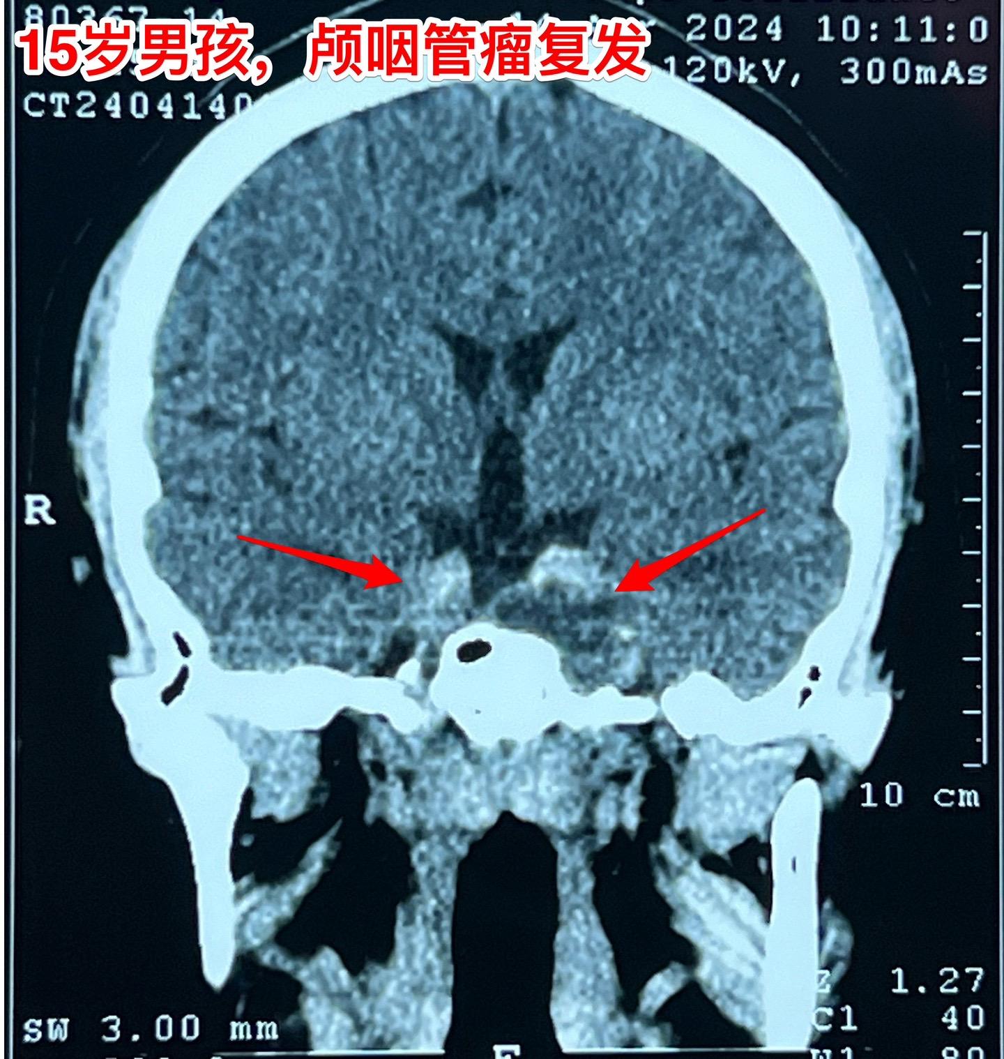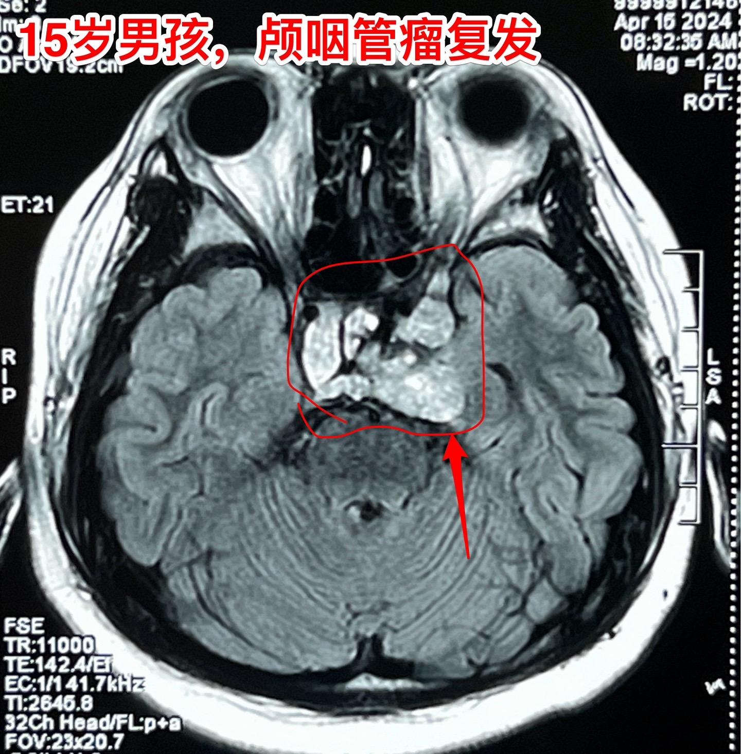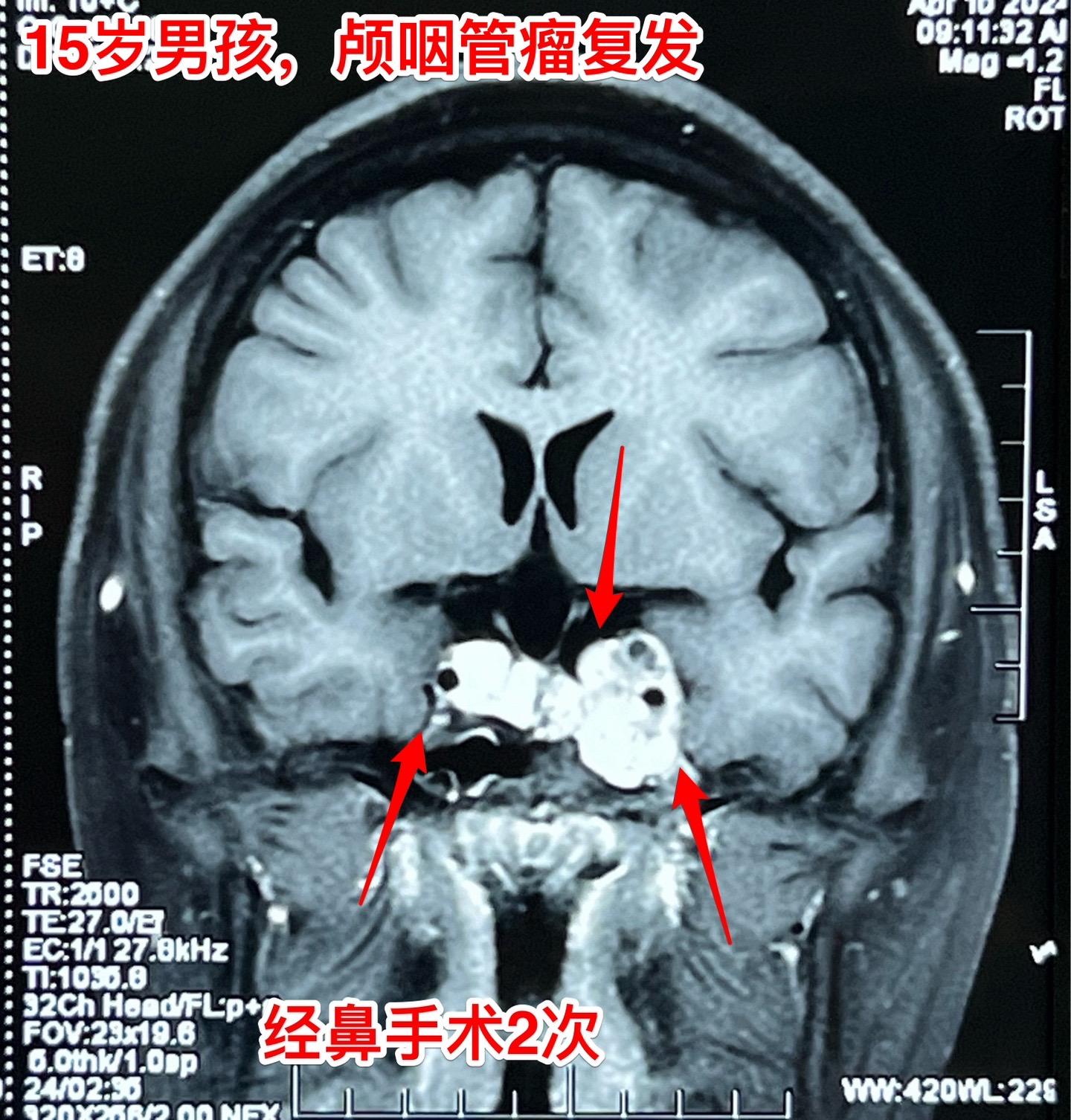 良性肿瘤也不一定容易治愈,颅咽管瘤就是。这个15岁大连市的男孩子因为颅咽管瘤先后作了两次手术,两次手术都是经鼻内镜手术。现在又复发了!从图片可以看见,这次肿瘤侵入左右两侧海绵窦,更难切除了。 在我科作了第三次手术,这次采用开颅手术。这样的手术医生很担忧出现脑脊液鼻漏的。这个病人手术后没有出现脑脊液鼻漏。 颅咽管瘤之所以容易复发是因为没有被彻底切除,如果彻底切除了也是可以治愈的。