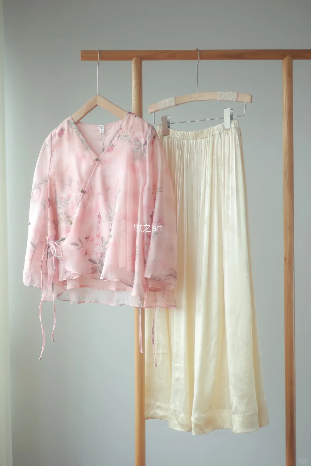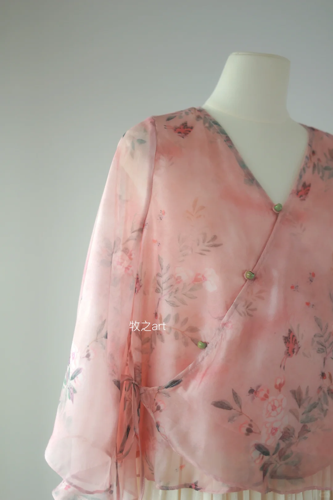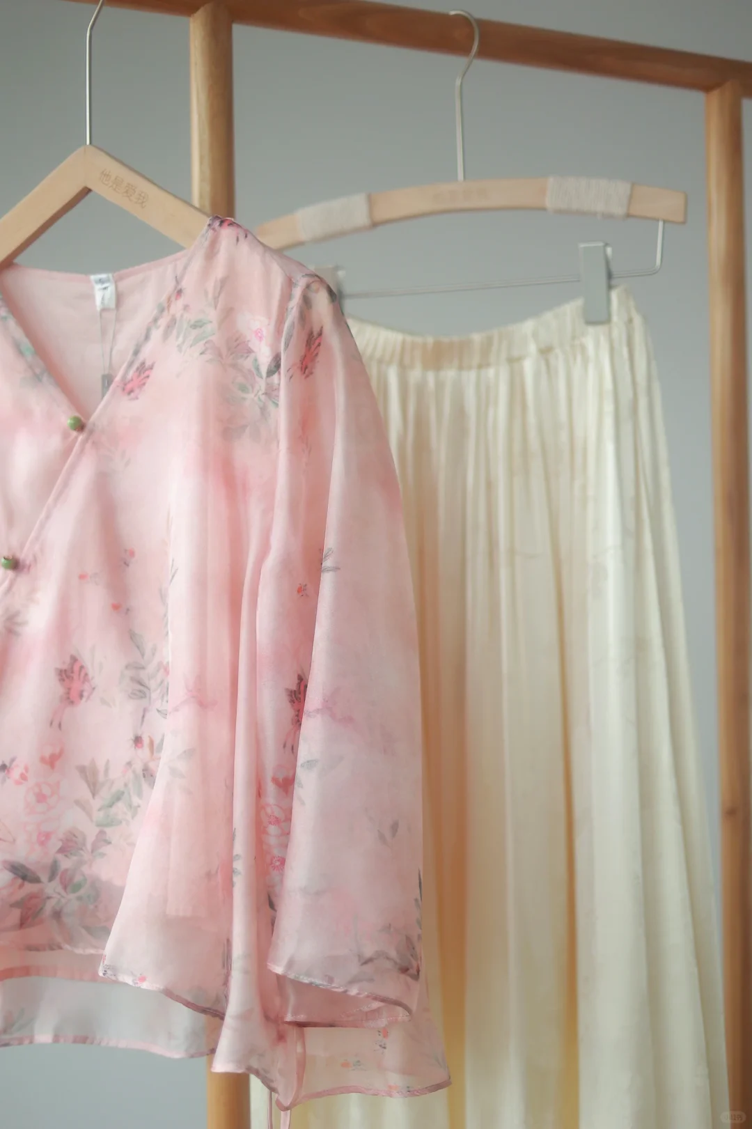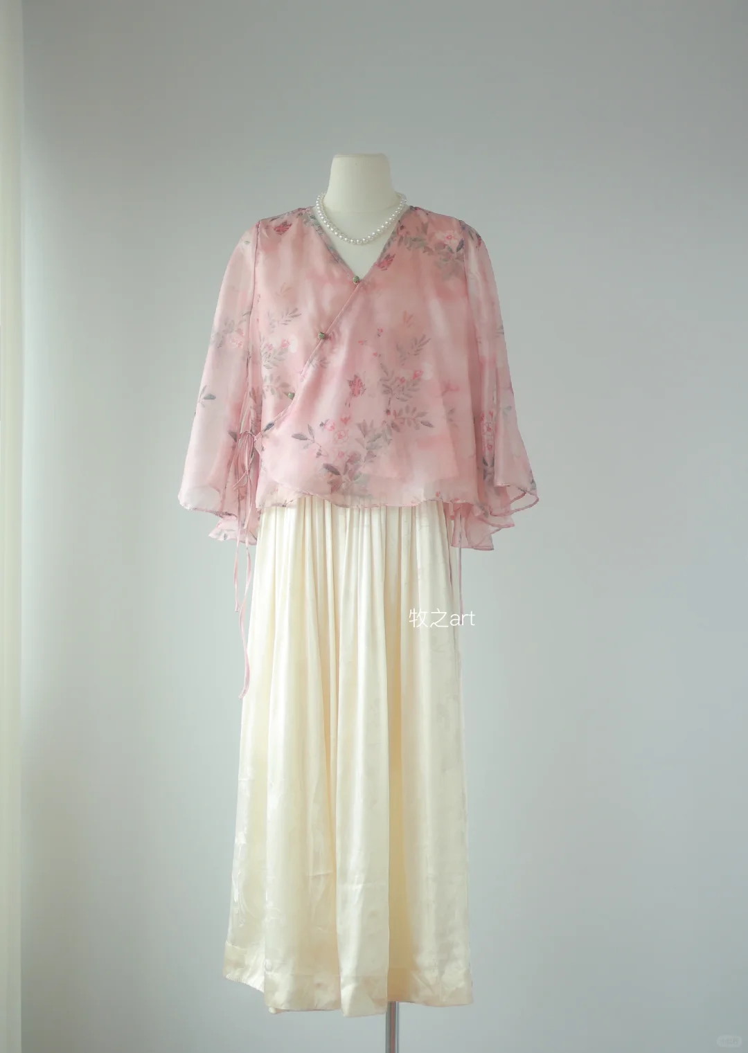自带古典温婉感的面料,印花很美 双层不透不闷汗,晕染朦胧感绝了 没有丝毫的俗气 且自带仙气 阳光下光泽感绝美,不由让人心动~ 交领设计,里面有内绑带整理版型 下摆层叠,像花瓣一样绽放 -