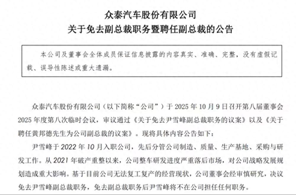 众泰汽车表示,尹雪峰于 2022 年 10 月入职公司,先后分管公司制造、质量、生产基地、采购与研发工作。从 2021 年破产重整以来,公司整车研发进度严重落后市场,对公司战略发展规划造成重大影响。基于目前公司无法复工复产的经营现状,公司董事会经审慎研究,决议免去尹雪峰副总裁职务,免去副总裁职务后尹雪峰将不在公司担任任何职务。