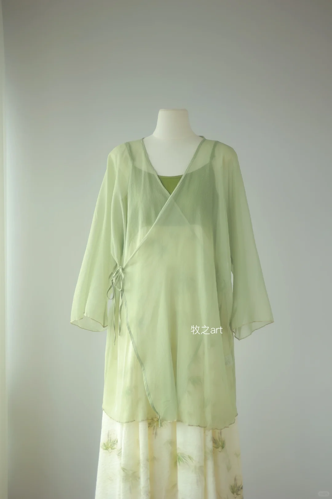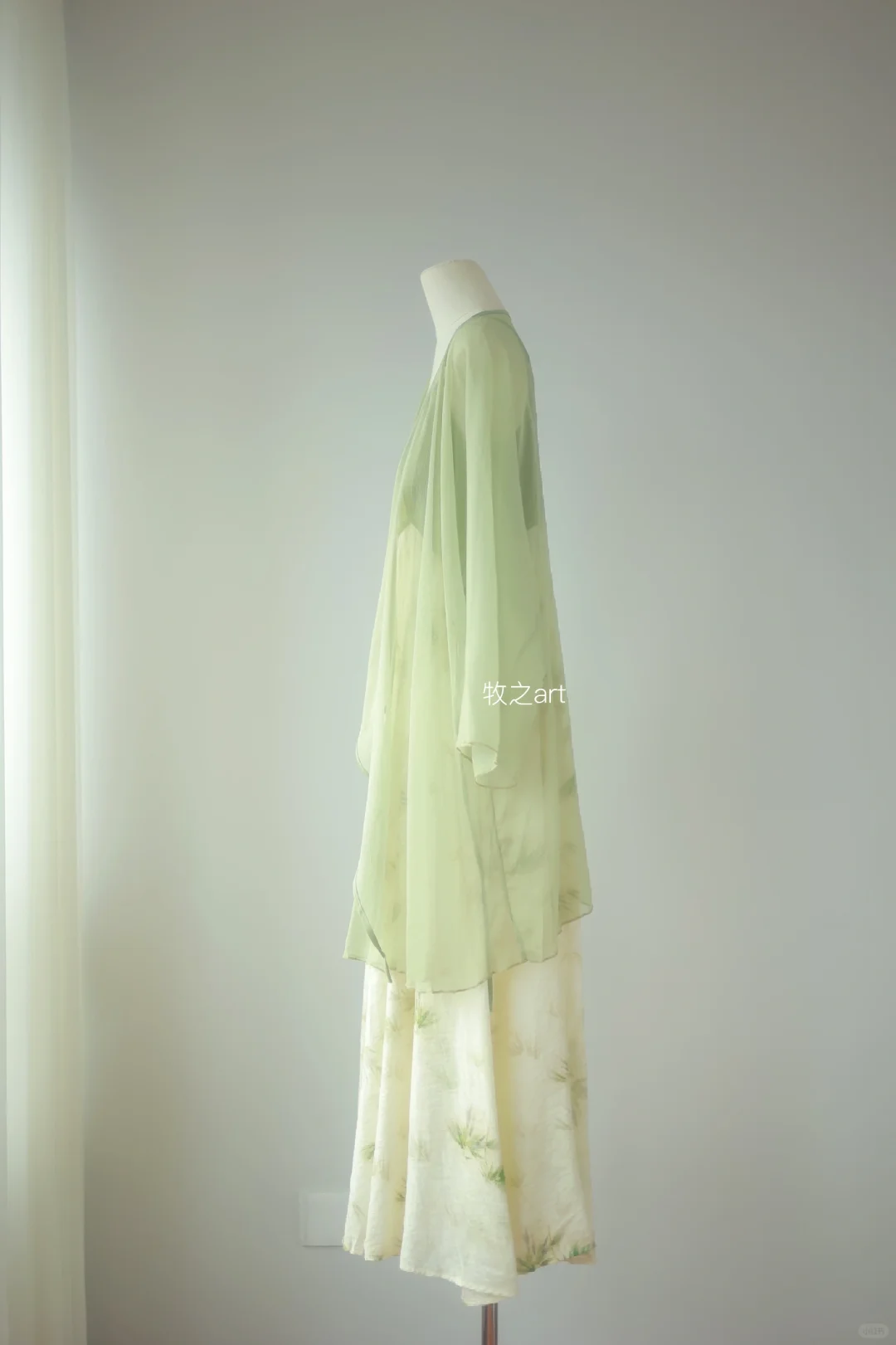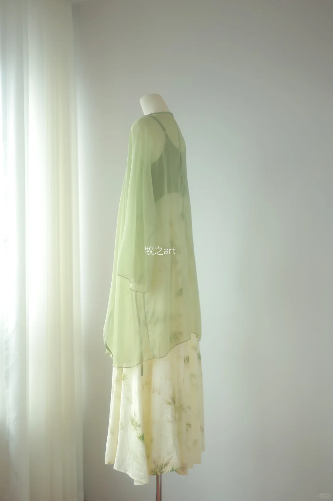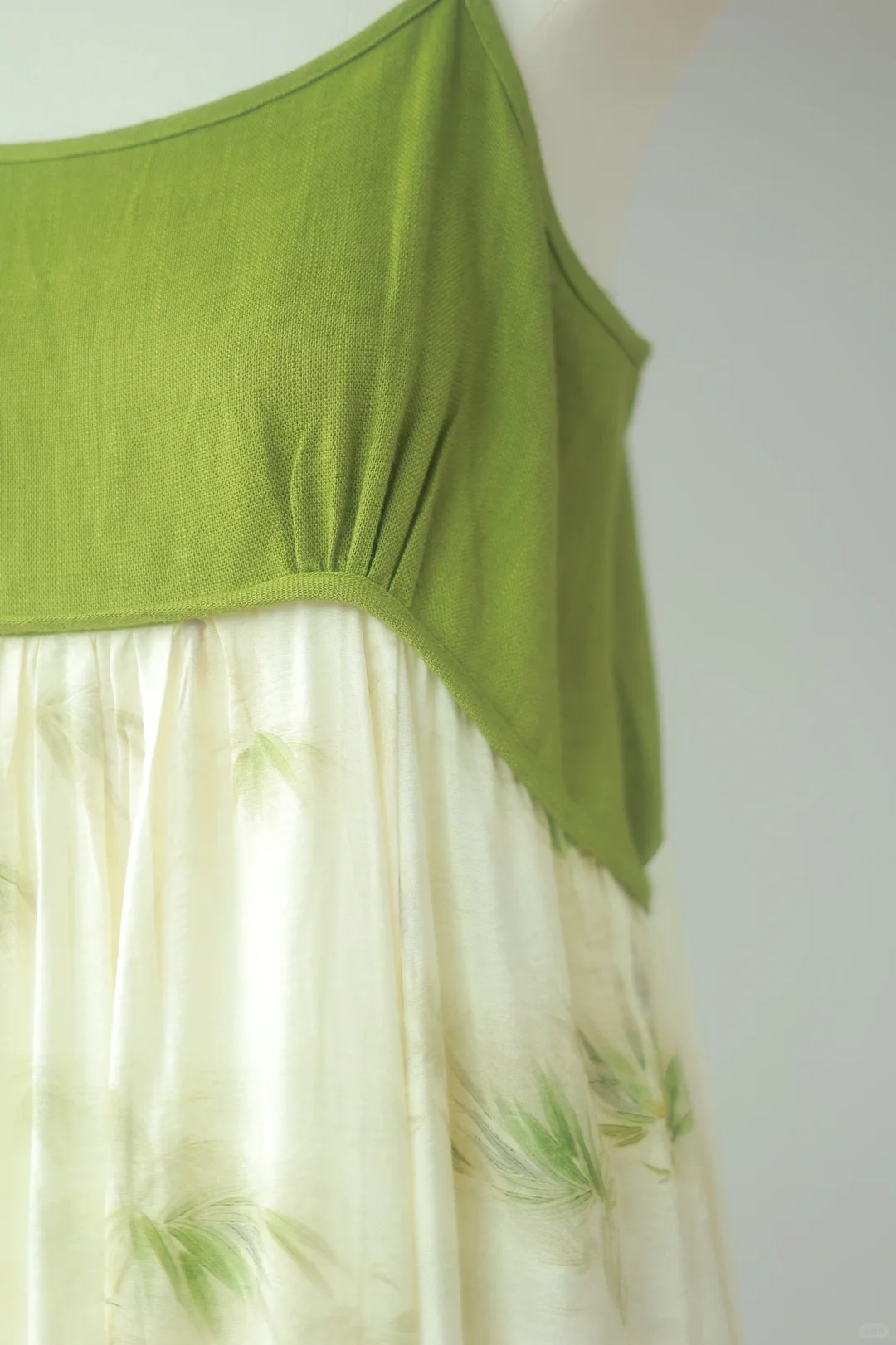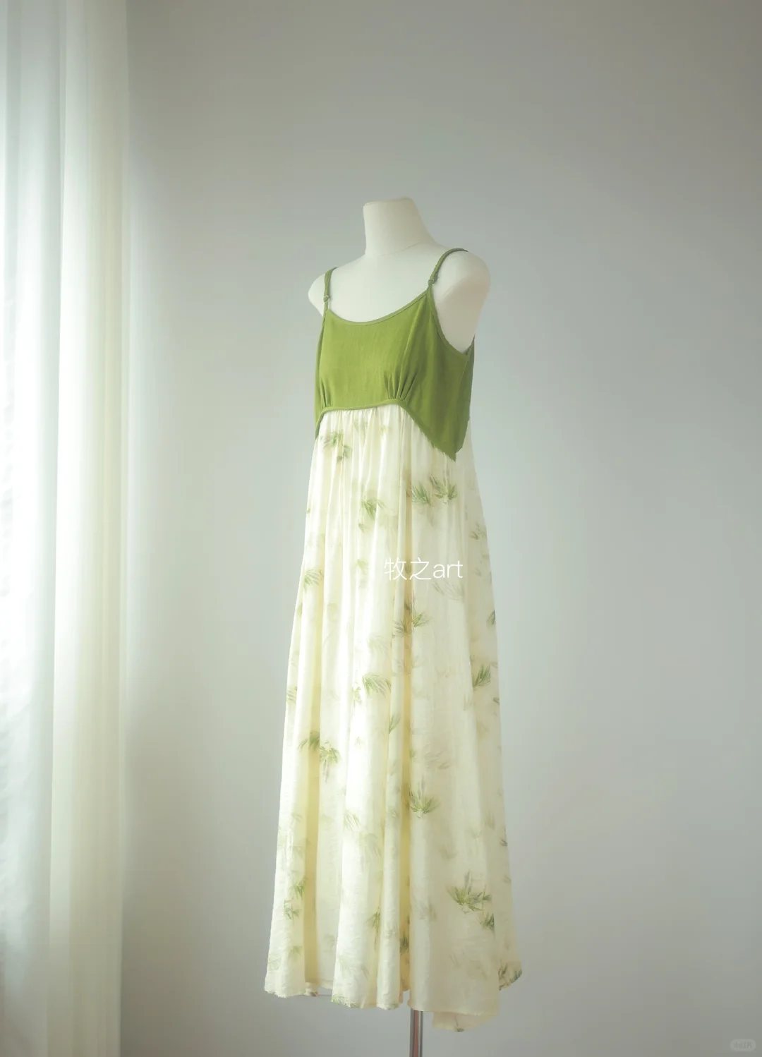 亚麻拼接丝麻竹叶印染,太有质感了 绿色属于冷色调,衬托皮肤显白 显白显气质 明亮清新,清冷感拉满 吊带裙就是要用料超足的大裙摆才够仙气~ 风吹过来裙摆飘扬,非常灵动 手臂上有肉肉,可以搭配同色系或米杏色外披,都很绝绝子好搭。 -