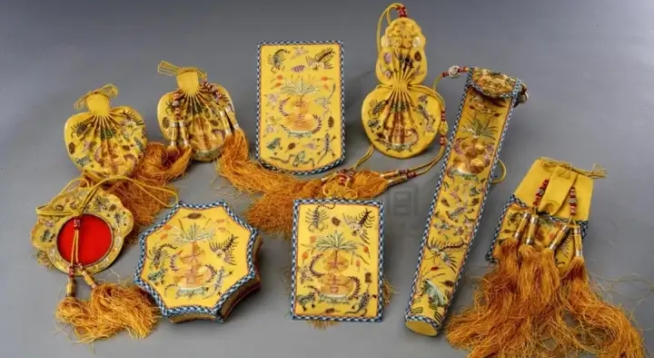 12、故宫博物院藏品中,有一套清宫端午节佩戴的五毒活计,共9件,其中荷包3件、烟荷包1件、表套1件、扇套1件、镜子1件、粉盒1件、名姓片套1件。