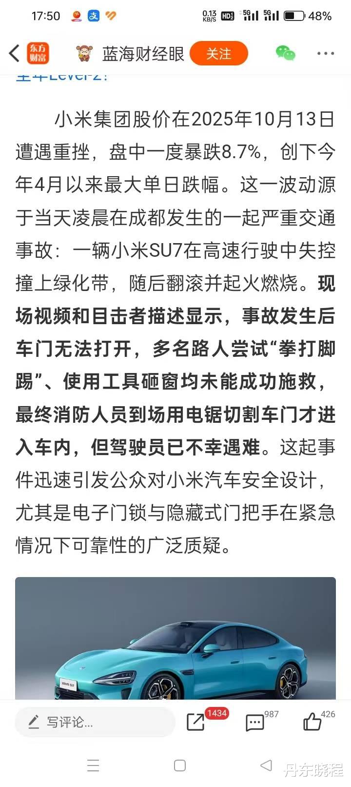 10月13日凌晨3时16分左右,小米SU7 Ultra在成都天府大道行驶时失控碰撞绿化带后翻滚至对向车道并起火。多名强壮男人勇敢上前试图打开车门,脚踹、手锤、石头砸,都没能打开车门。最终驾驶员不幸遇难。13日上午,小米集团股价应声下跌8.7%。