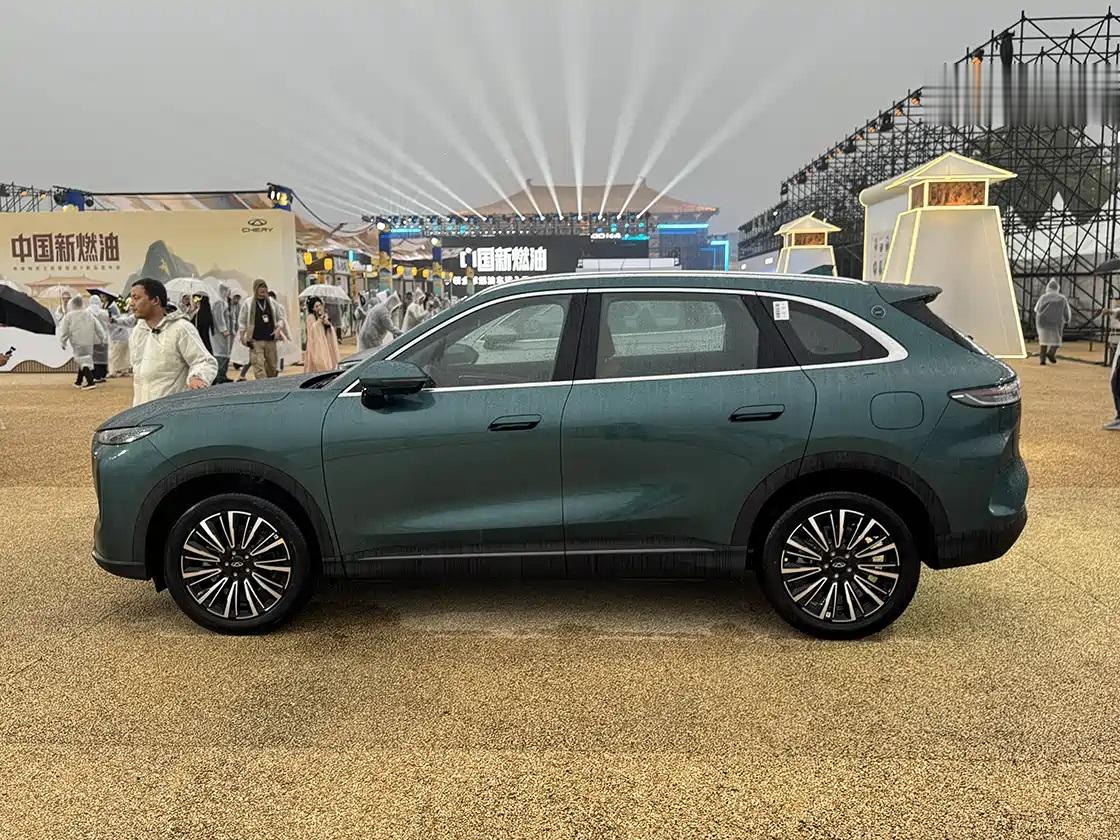 从侧面看,全新瑞虎8采用了溜背式车顶设计,C柱向前倾斜,营造出向前俯冲的动感姿态,车身腰线突出,搭配隐藏式门把手和底部凌厉的装饰条,进一步强化了运动氛围,轮毂则采用了细条幅密集设计,整体造型稳重而不失精致感。