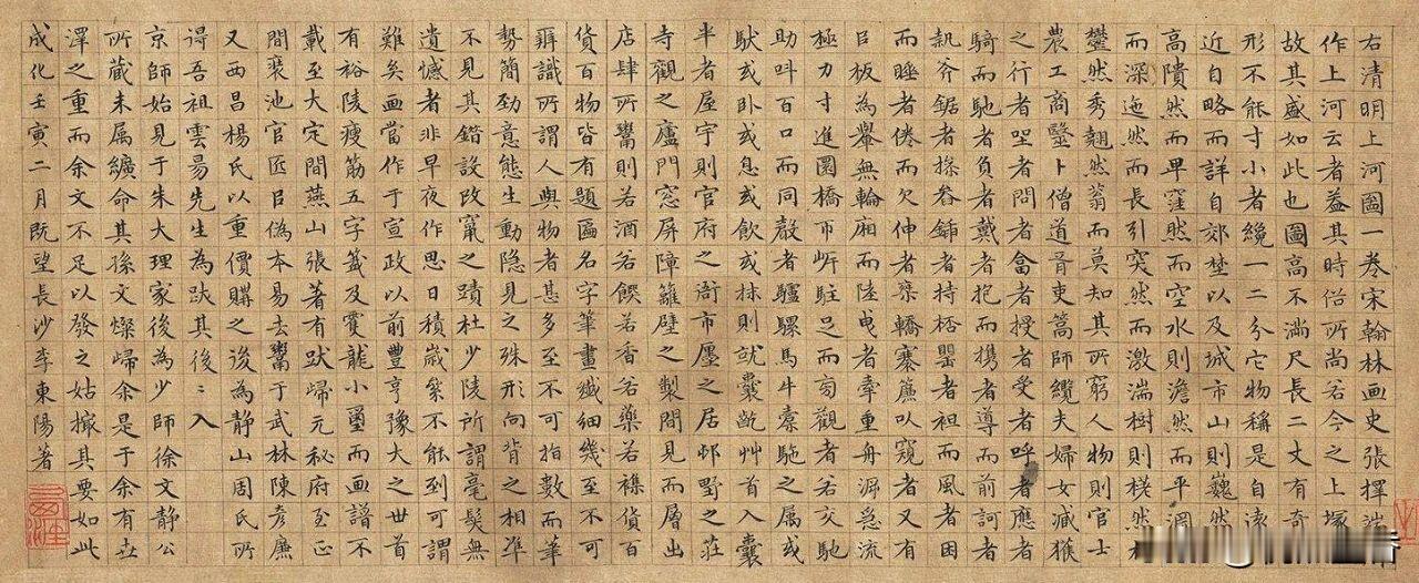 李东阳,你的小楷《清明上河图》题跋也太漂亮了吧,不愧是宰相呀! 如果你看过《明朝那些事》的书,会记住这住首辅的,虽然篇幅没有像高拱、张居正那么长,但给人的印象也颇深,老成而有谋略,为人比较正派,有才华而不自傲。 不过,很多人不知道,他的书法也是很厉害,他十七岁考取进士,书法不厉害是万万不可的。他长于篆、隶、楷、行、草书,明代的“台阁体"也有他的一份功劳。 #书法##书法欣赏##毛笔书法#