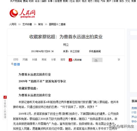 (信源:人民网《收藏家蔡铭超:为兽首永远退出拍卖业》)