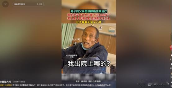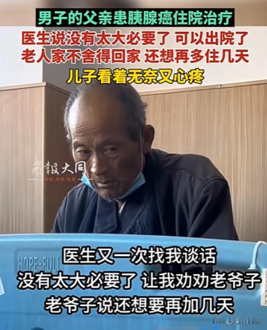 (信源:晨报大同——2023-11-30男子的父亲患胰腺癌住院治疗,医生说没有太大必要了 可以出院了,老人家不舍得回家 还想再多住几天!儿子看着无奈又心疼)