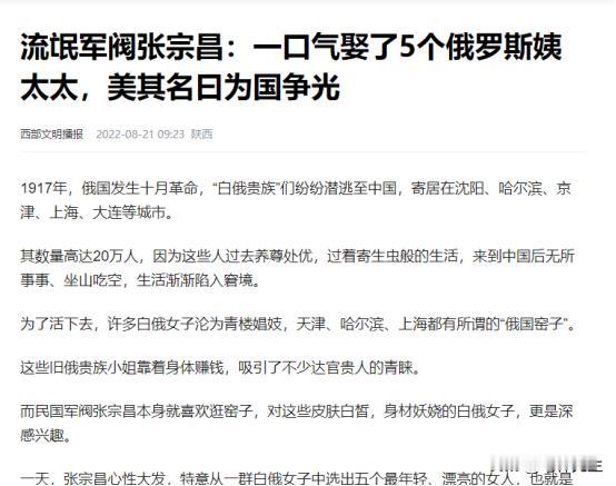 (信息来源:流氓军阀张宗昌:一口气娶了5个俄罗斯姨太太,美其名曰为国争光.西部文明播报.2022-08-21)