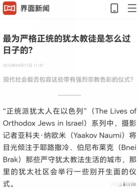(信息来源:界面新闻:最为严格正统的犹太教徒是怎么过日子的?)