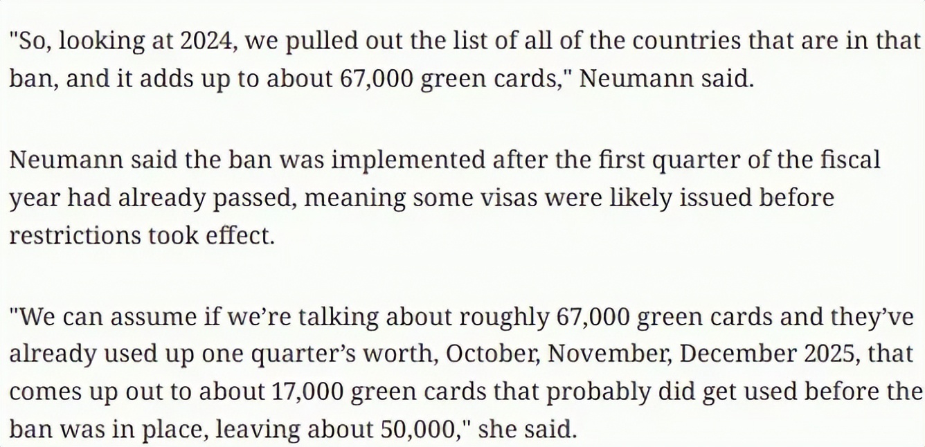 由于限制措施在2026财年第一季度(2025年10月至12月)结束后才全面落地,该季度已消耗了约1.7万张配额。据此估算,若禁令在2026财年剩余时间内持续生效,将留下约5万张未使用的亲属移民绿卡。