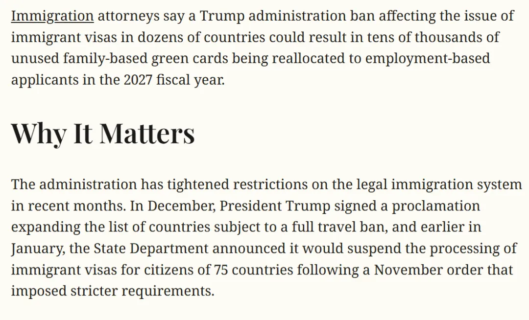 另一方面,这5万张潜在名额最终能否顺利落地,仍存在不确定性。主要变量包括:国会是否通过立法重新分配签证、旅行限制政策是否在财年结束前解除、以及审批机构在实际操作中是否会因“公共负担”审查趋严等因素放缓整体审理速度。