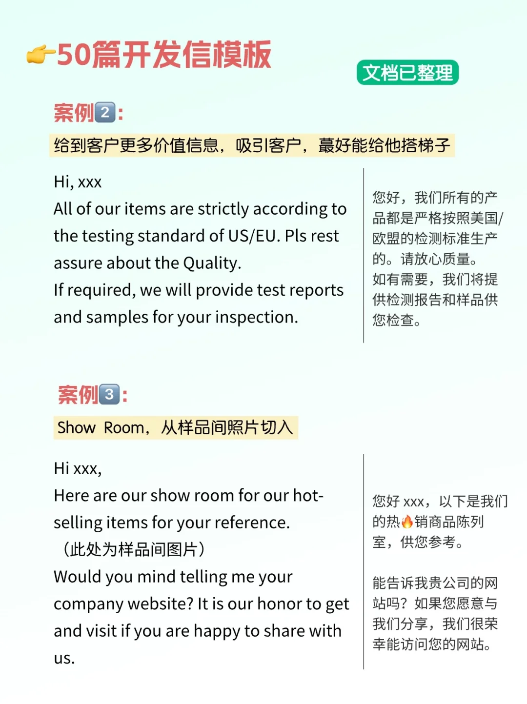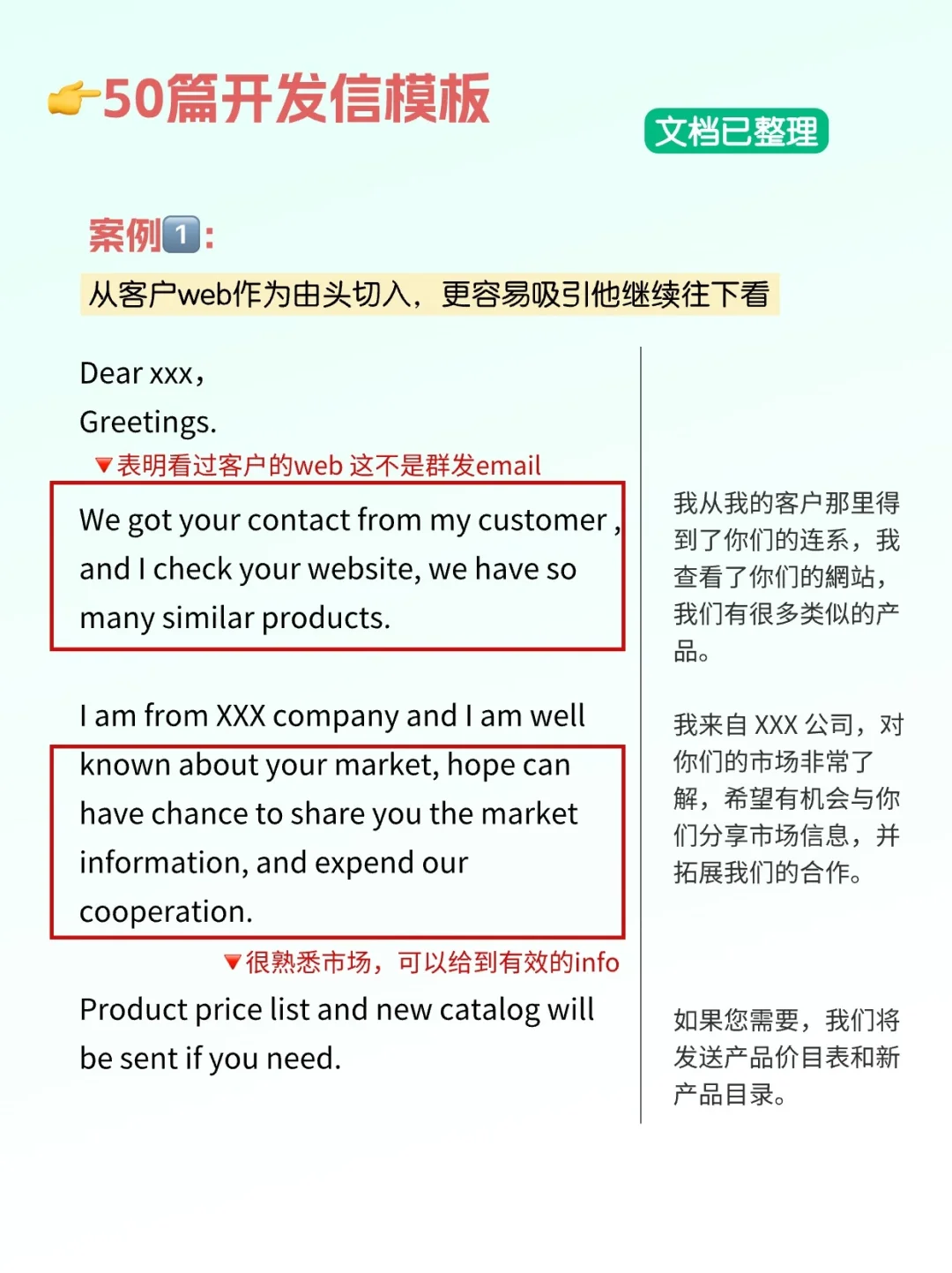这里再说一些小tip,比如说开发信开头要把客户的名字写清楚写正确,包括你的名字也一样,不要和末尾的签名对不上。
