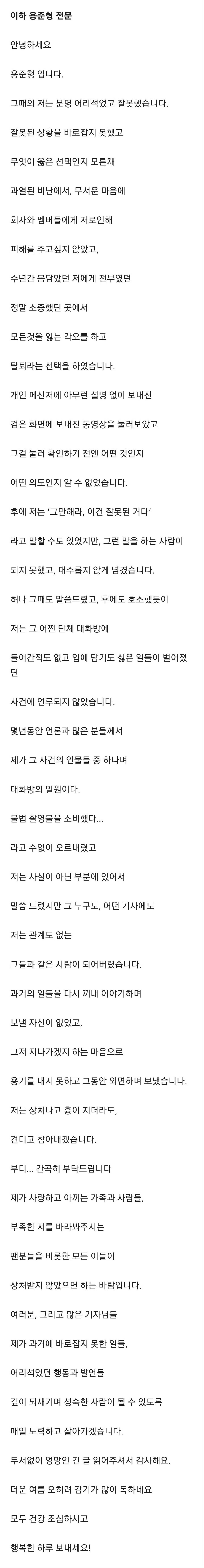 #龙俊亨时隔5年道歉# 龙俊亨时隔5年因为涉及郑俊英聊天室事件道歉,称:“看过郑