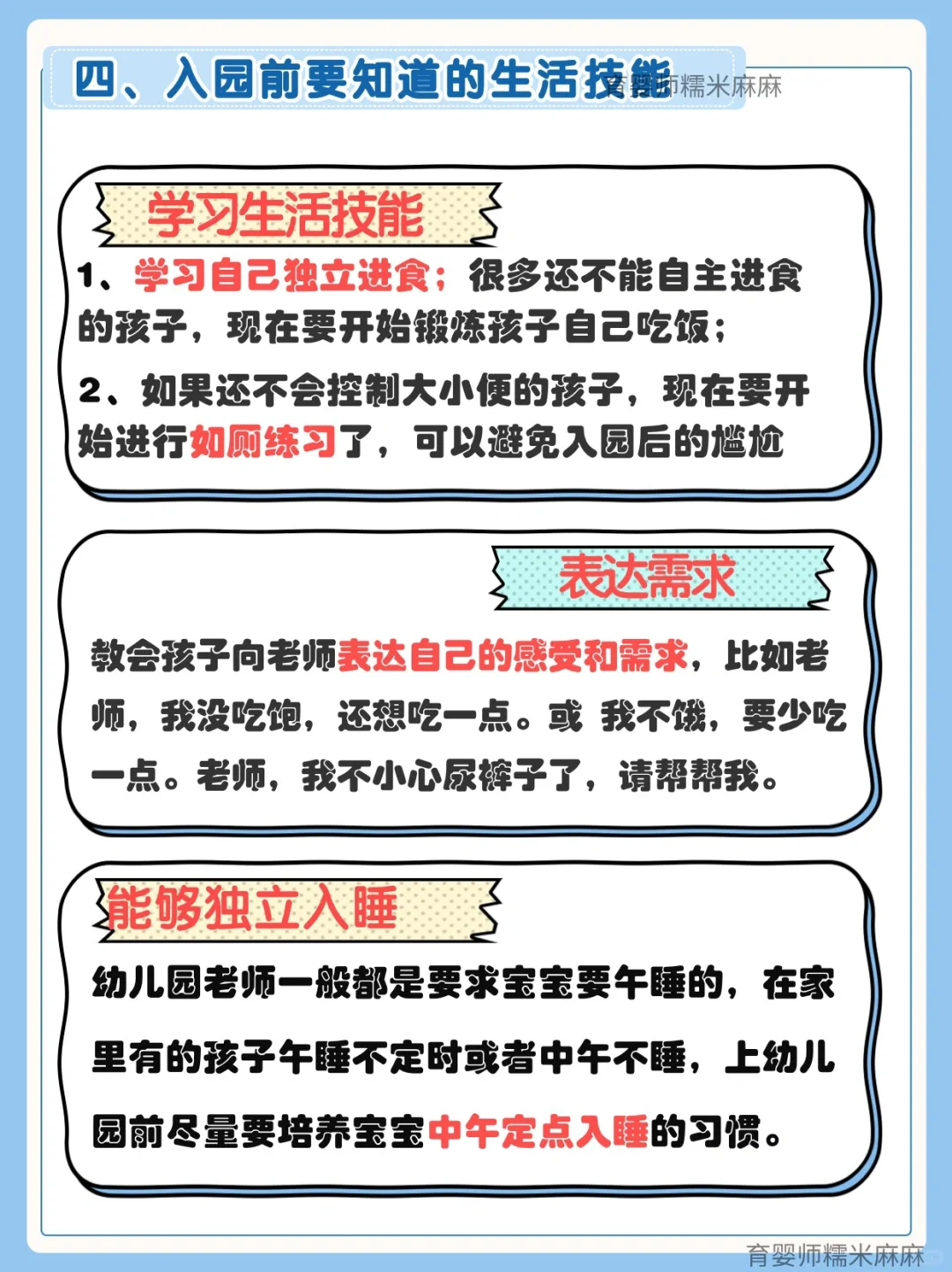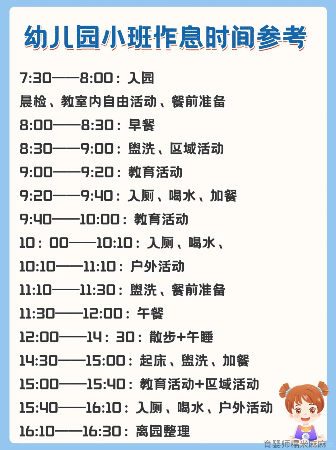 5、作息调整:提前按照幼儿园的作息时间表做调整睡眠,早睡早起,培养中午午睡的习惯。