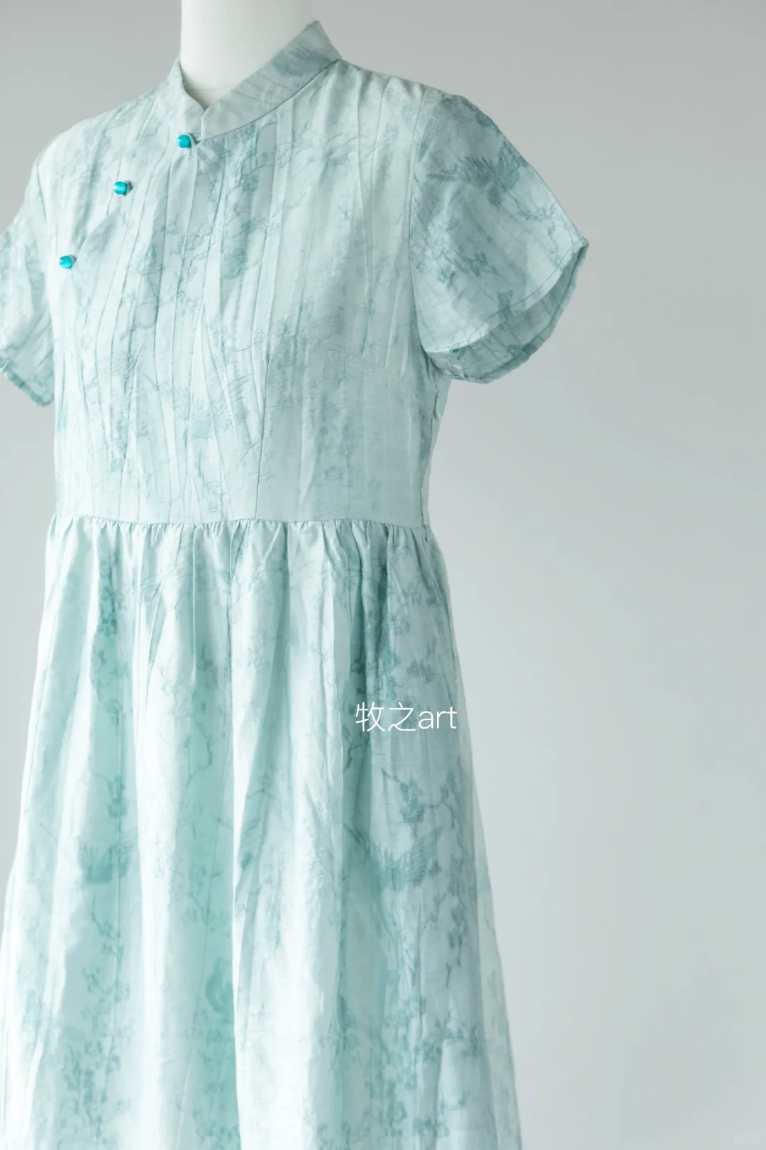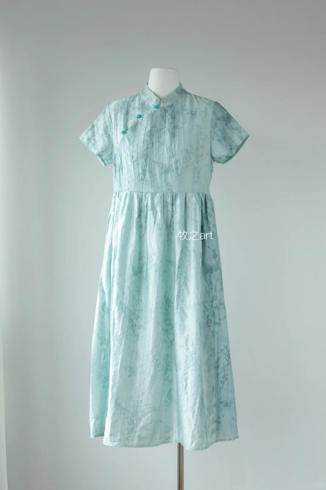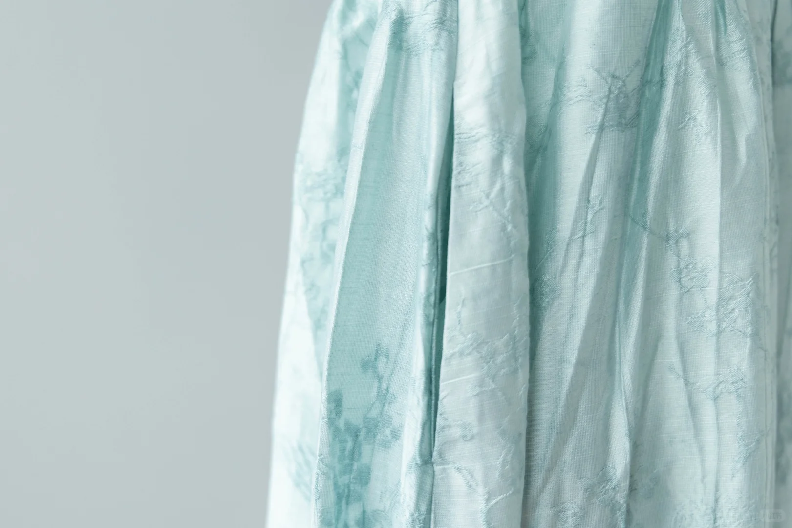 重新拍照,这次是阴天出来的颜色,很淡的很特别的蓝色,清凉高级,不自觉安静下来 和浣溪一样的丝麻面料,精致提花工艺 面料做的不均匀的炒色工艺,自然晕染的感觉 两个颜色都不是亮色系的,白皮不挑,对黄黑皮也很友好 -