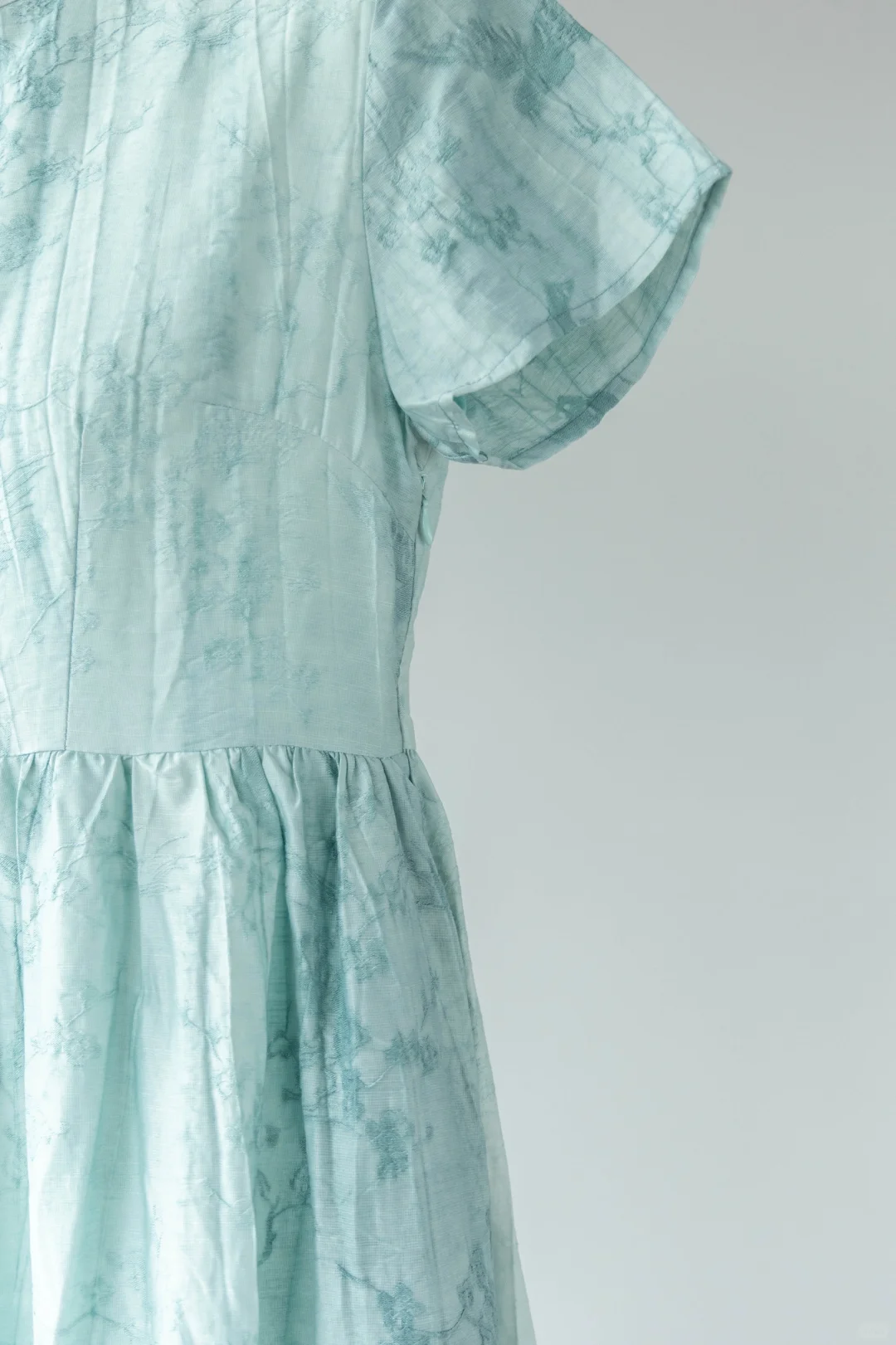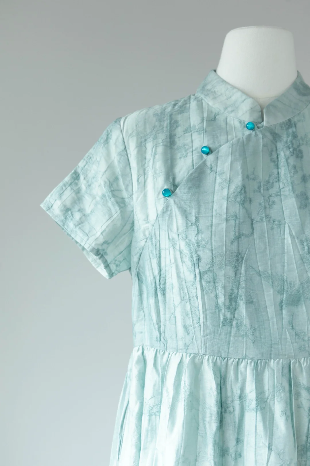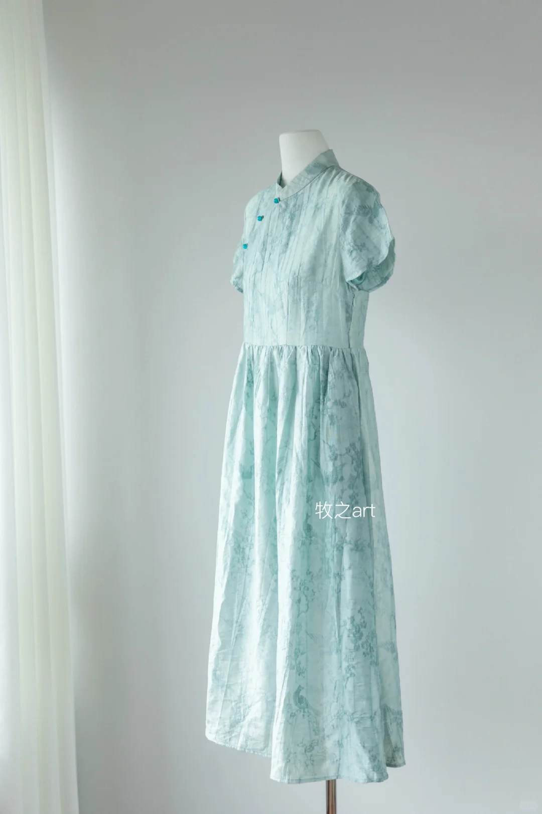 重新拍照,这次是阴天出来的颜色,很淡的很特别的蓝色,清凉高级,不自觉安静下来 和浣溪一样的丝麻面料,精致提花工艺 面料做的不均匀的炒色工艺,自然晕染的感觉 两个颜色都不是亮色系的,白皮不挑,对黄黑皮也很友好 -