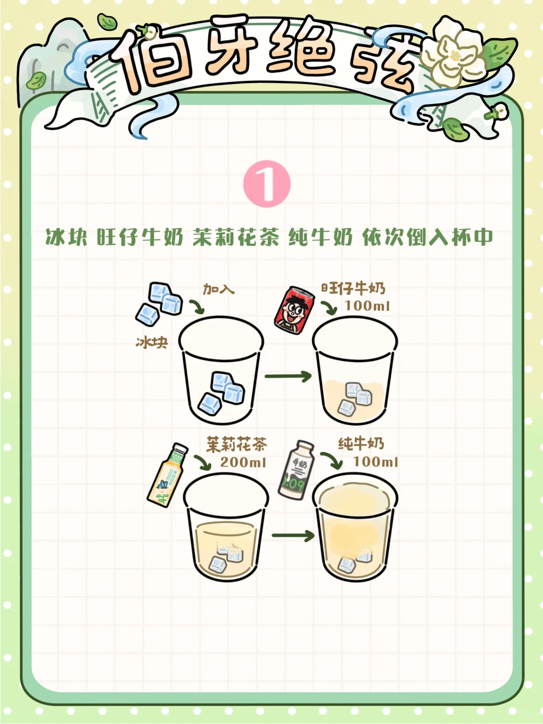 1️⃣冰块🧊 旺仔牛奶 茉莉花茶🍵 纯牛奶🥛依次倒入杯中( 1:2:1的比例也可以根据自己的喜好稍微调整👍自制的好处)
