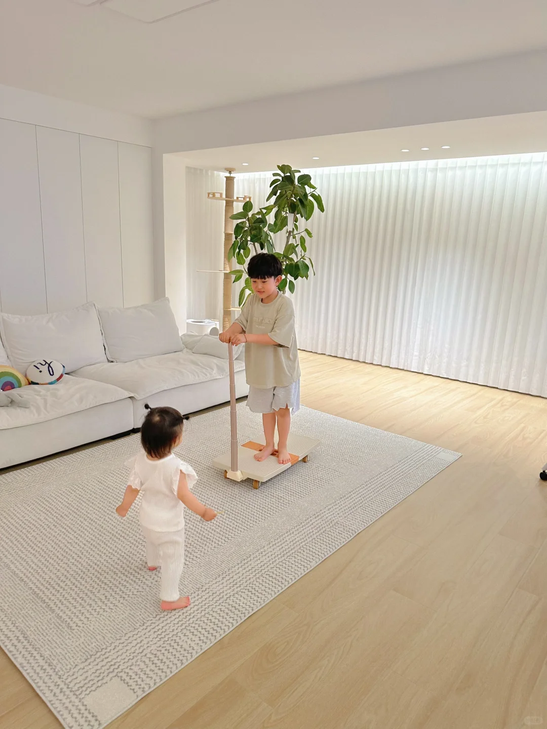 最喜欢的就是家里的客厅 客厅两面做衣柜,开间5.4米。 一张舒服的帆船沙发,一块柔软的地毯, 一个自动支架电视组成了整个客厅。 儿女双全,小朋友可以在客厅尽情的玩耍 手袋推车除了可以收纳、拉货、做露营车,也成了孩子们的玩具。 风不急,云不卷,生活慢慢,这样舒适又惬意 你们喜欢这样的客厅吗?