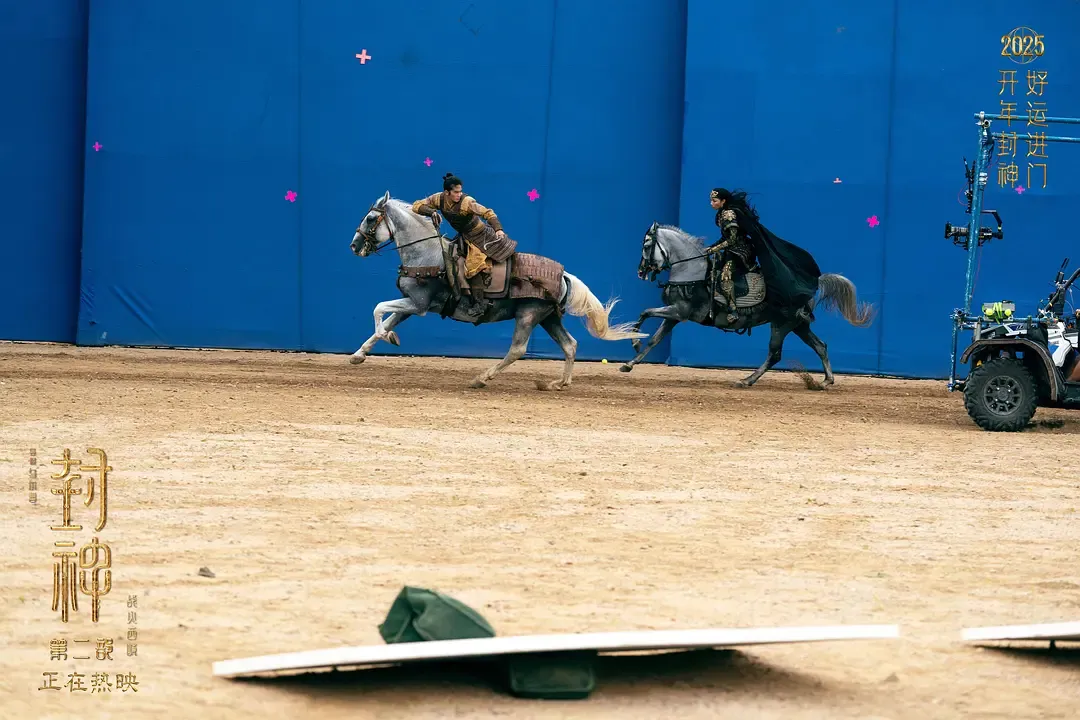 专业马术,真人实拍,成为影片动作场面最大亮点。西岐少主姬发(于适 饰)与殷商先锋官邓婵玉(那尔那茜 饰)有一场高速马上的双人对决。两人在两匹全速奔跑的骏马上,于最近距离仅半米的空间内完成刀剑交锋。更为震撼的是,所有“马上起扬”、“镫里藏身”、“后仰铁板桥”等专业马术动作,以及“左右开弓”、“三箭连射”等高阶骑射技巧,均由演员亲身上阵,真正实现“零替身”。