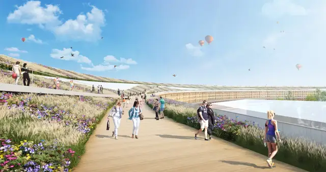 回廊采用无障碍绿色屋顶,既能抵御风雨,又能带来迷人的体验;绿植与花朵覆盖屋顶,形成“空中花园”。登上屋顶的参观者,将拥有更多视角欣赏环内形态各异的展馆,以及外围旷阔海景。