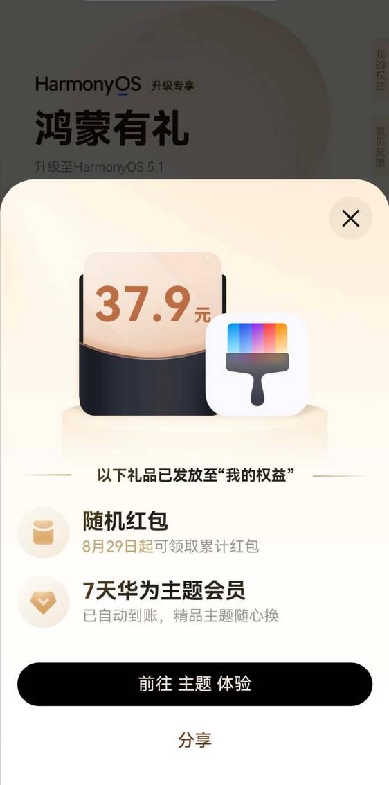 家人们谁懂啊!每次看到别人手机各种漂亮的主题,但又不舍得开会员的感觉太难受了哇!还好最近手机没少刷!听说华为发福利,只要把符合条件的手机升级到最新的鸿蒙5.1,就能冲“鸿蒙有礼”的活动,其中就有机会抽中主题会员!这下好了,今天用清新森系、明天换赛博朋克,手机皮肤想怎么换就怎么换,彻底实现“主题自由”!
