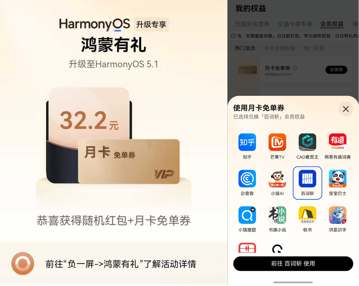 更绝的是第三方权益诚意也直接拉满!抽中“月卡免单券”的话,哔哩哔哩、优酷、WPS、喜马拉雅、芒果TV等会员随便兑,不管是追番、办公还是听播客,需求全覆盖;最近还新增了知乎、网易有道词典、百词斩可以兑换,连宝妈需要的宝宝巴士、书虫爱用的书旗小说都安排上了,简直是“全家桶”级福利!