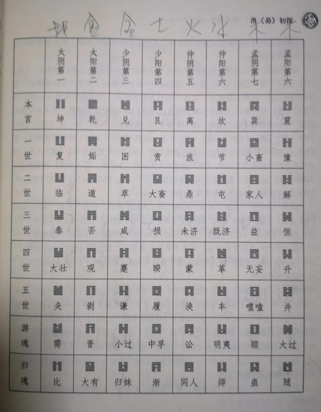 我们看到上面的六卦是由乾卦每次变动一个爻位形成的,因此可以把乾卦看作老祖宗,第一卦是儿子,叫一世卦,第二卦是孙子,叫二世卦,第三卦就是三世卦,第四卦是四世卦,第五卦是五世卦,这样八宫的前六卦就很形象了。