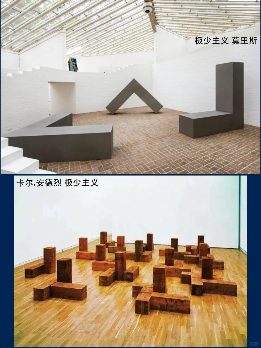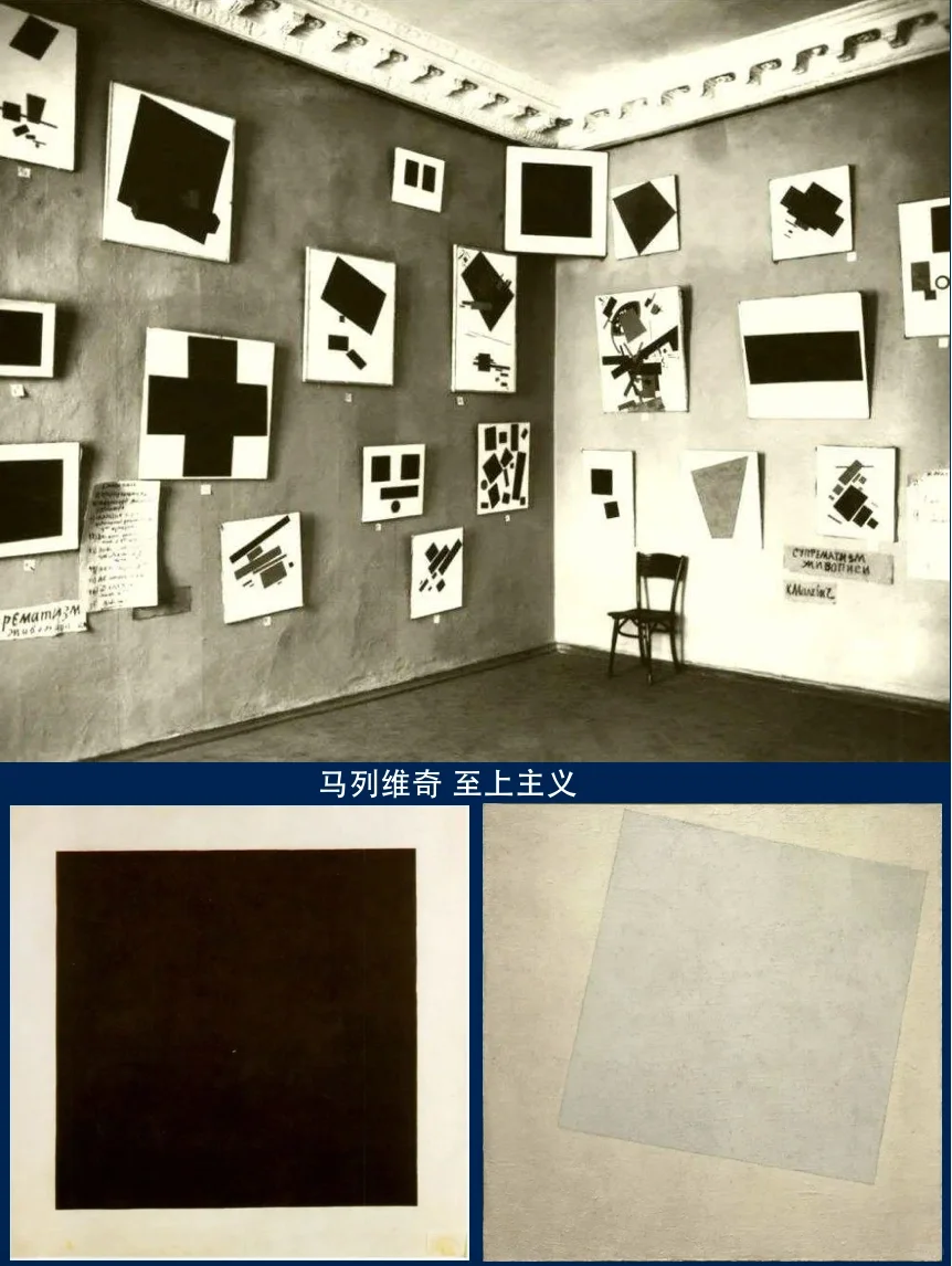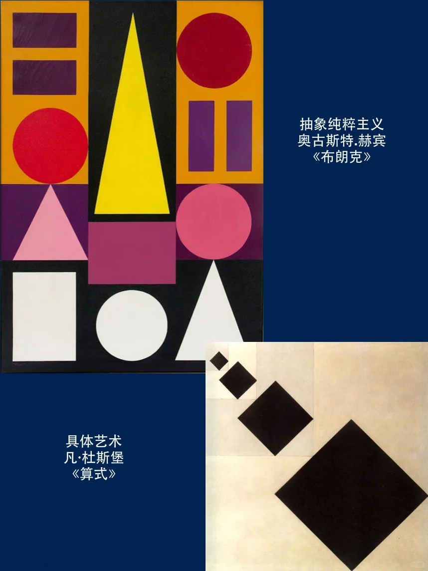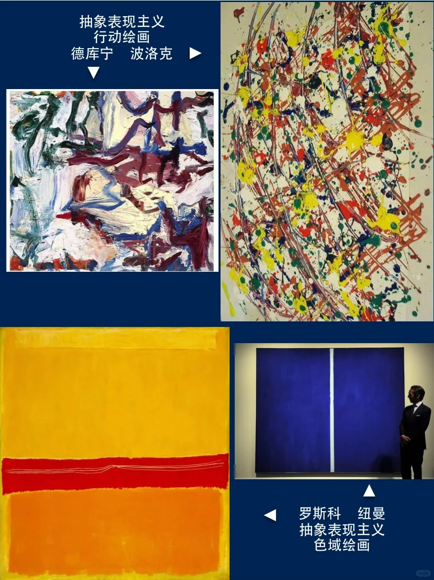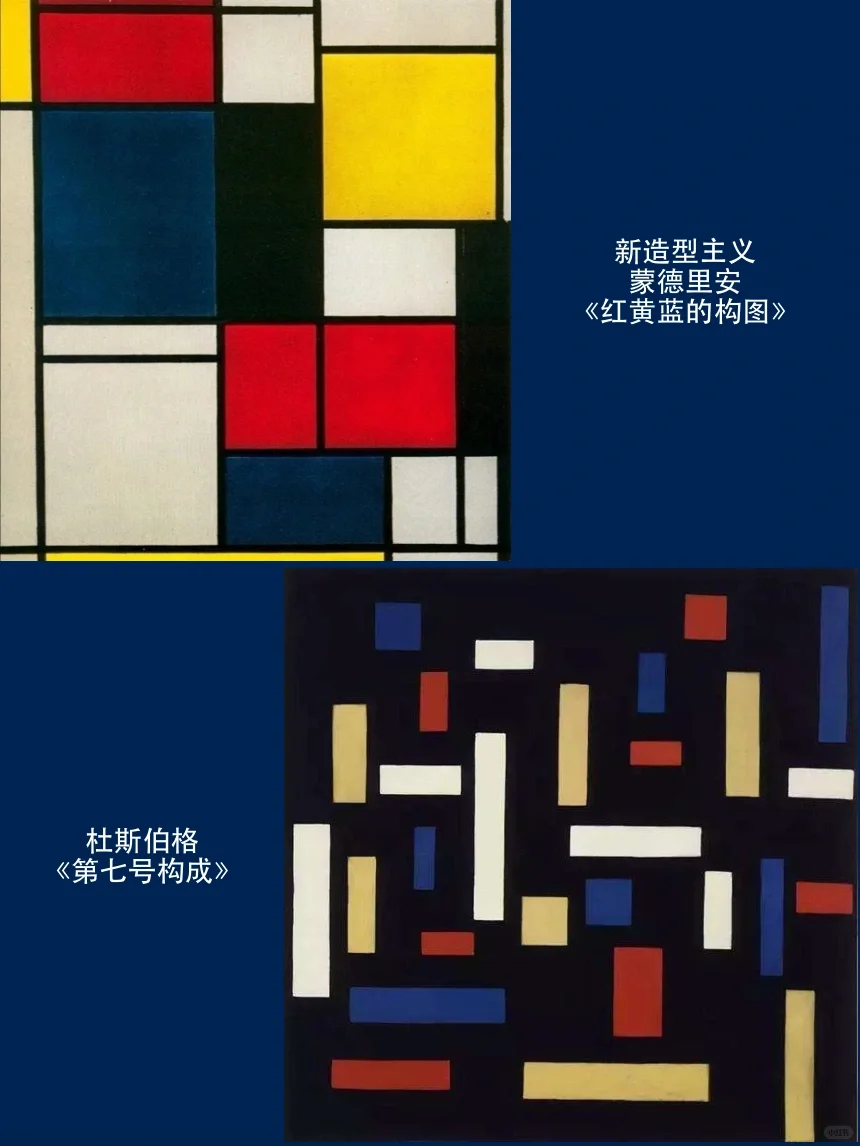 🔸抽象主义 以前画家大多偏向写实,相机出现以后,部分画家开始不拘谨于具象表达,比如塞尚笔下的圣维克多山。 但那时的画,仍是从现实题材出发。直到1910年,康定斯基创作出《第一张抽象水彩画》,才标志着抽象主义的诞生。 他的画,初看下来3个感受:1 色彩丰富,这和他受到印象派、新印象派、野兽派等风格影响有关。 2 几何元素,康定斯基认为,只有脱离现实,才能真实反应艺术家的精神世界。 3 韵律感,人家是音乐发烧友啦。 🔸至上主义 康定斯基充满动感、即兴和情绪化的风格,被称作热抽象。而接下来两位则是冷抽象的代表,他们的作品简洁、纯粹、有规律性。 首先是马列维奇,他的画主要由黑、白和几何形状组成,这种剥离物质、形体至上的效果,叫做至上主义。 🔸构成主义 当时与马列维奇相爱相杀的,是构成主义发起人塔特林。他借鉴了至上主义的几何风格,但主张为人民服务,因此应用领域主要集中在建筑、平面设计和摄影中。 🔸新造型主义 受到苏联构成主义影响,荷兰也在如火如荼地在搞风格派,其中便诞生了冷抽象的第二位大佬:蒙德里安。 他最知名的红蓝图,就是用原色+线条组合,让画面看起来极致简化。 20世纪30-40年代,抽象艺术运动在巴黎发展,并形成两个研究方向。 🔸抽象纯粹主义:就是纯抽象创作。代表人物奥古斯特.赫宾创建了属于自己的字母表,把字母和颜色,形状联系在一起。比如他画了一个肖像,最终会呈现一堆几何体,还挺酷的是不? 🔸具体艺术:凡·杜斯堡为其定名,他认为形状是具体而真实的,用算数布局艺术构图才是最理想的。 🔸抽象表现主义:二战时期,艺术阵地转移至美国,美国出现了第一个现代艺术运动:抽象表现主义。 这一画派有两种风格,一个是行动绘画,往画布泼洒颜料,随意大胆。另一个是色域绘画,在画布平涂纯色,沉静有力。 🔸单色绘画:抽象艺术在色彩领域的运用,一直延续到60年代。克莱因相信单色能唤起内心强烈感受,所以创造了克莱因蓝。赖因哈特认为油画不可复制,所以画一系列黑色呈现黑的变化。 🔸极少主义:在抽象艺术和构成主义影响下,极少主义诞生了。只展示物体,不赋予意义,是极少主义的中心思想。所以无论是莫里斯的L型字体,或是卡尔.安德烈未经雕刻的木块,都有一个共同的名字,叫《无题》。