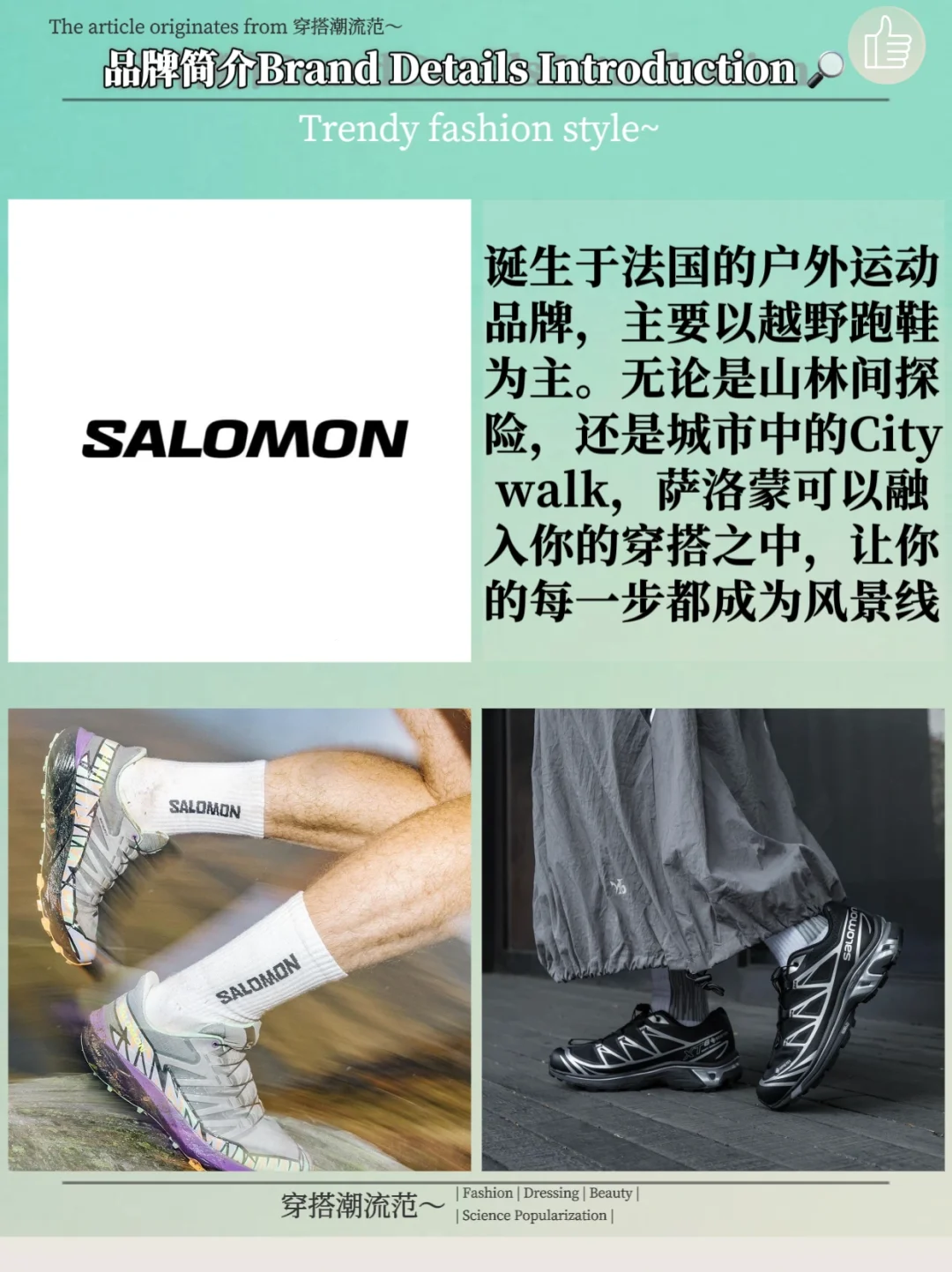 诞生于法国的户外运动品牌,主要以越野跑鞋为主。无论是山林间探险,还是城市中的City walk,萨洛蒙可以融入你的穿搭之中,让你的每一步都成为风景线
