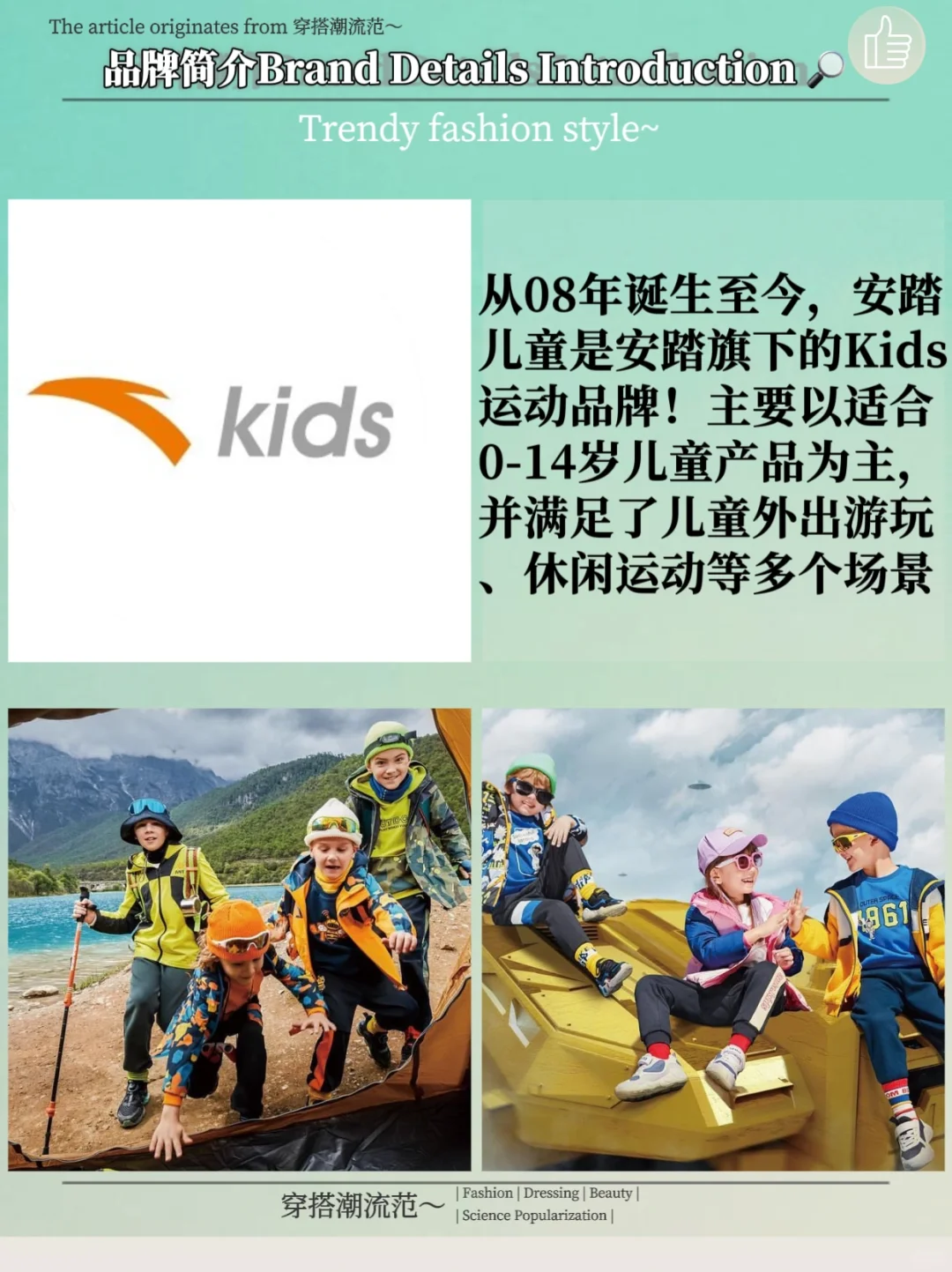从08年诞生至今,安踏儿童是安踏旗下的Kids运动品牌!主要以适合0-14岁儿童产品为主,并满足了儿童外出游玩、休闲运动等多个场景