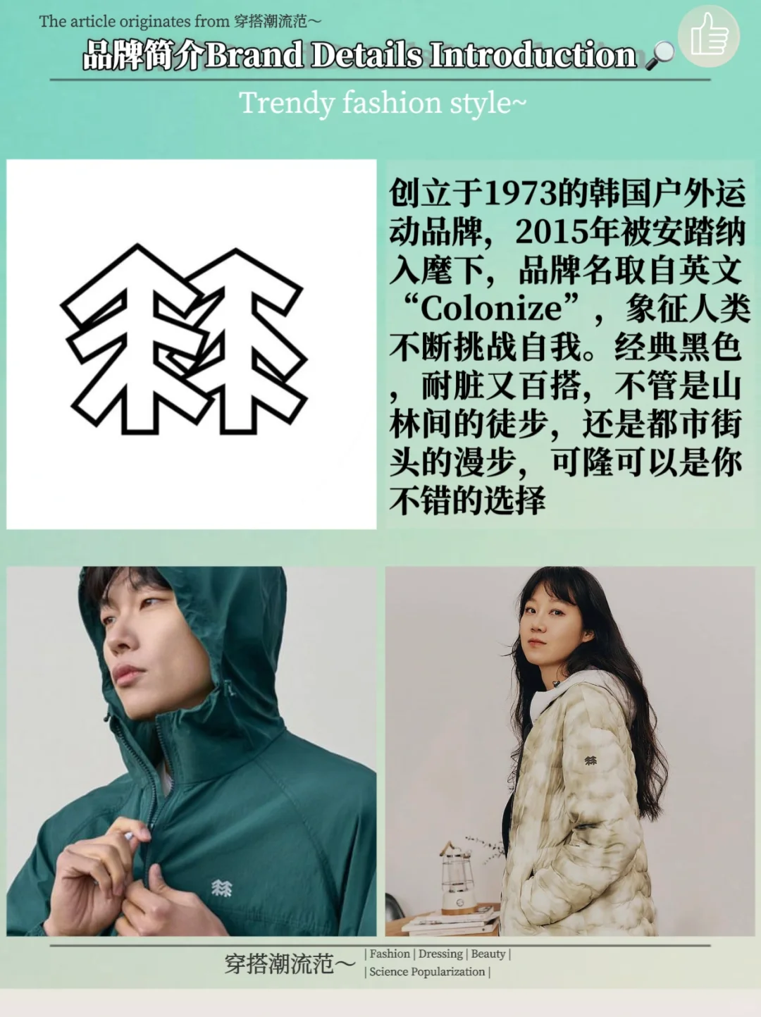 创立于1973的韩国户外运动品牌,2015年被安踏纳入麾下,品牌名取自英文“Colonize”,象征人类不断挑战自我